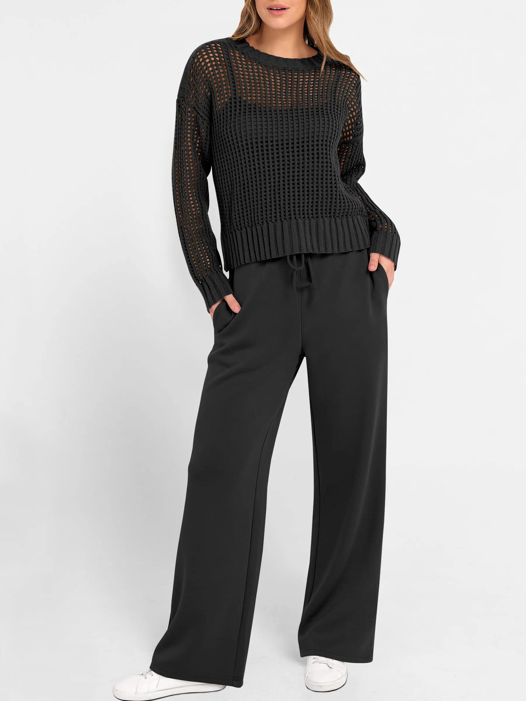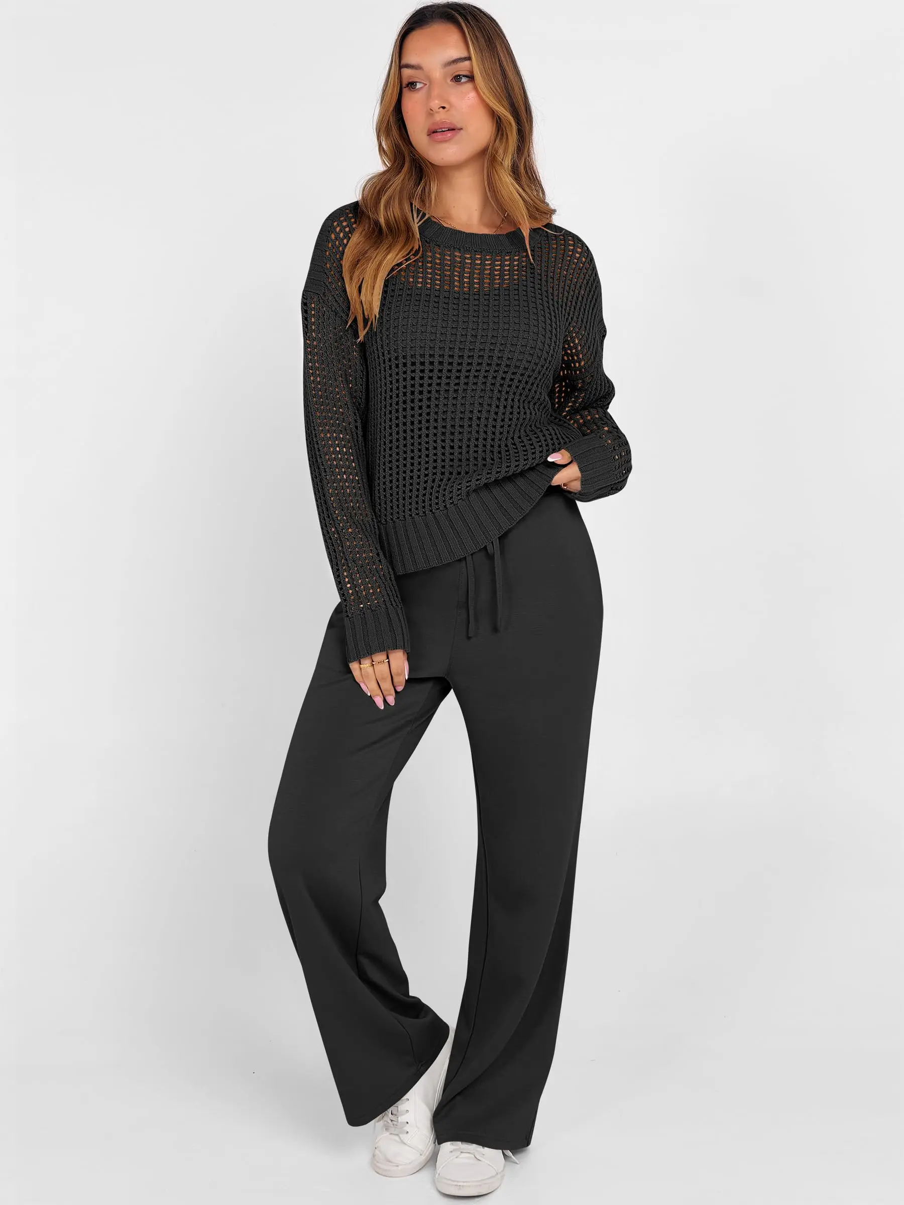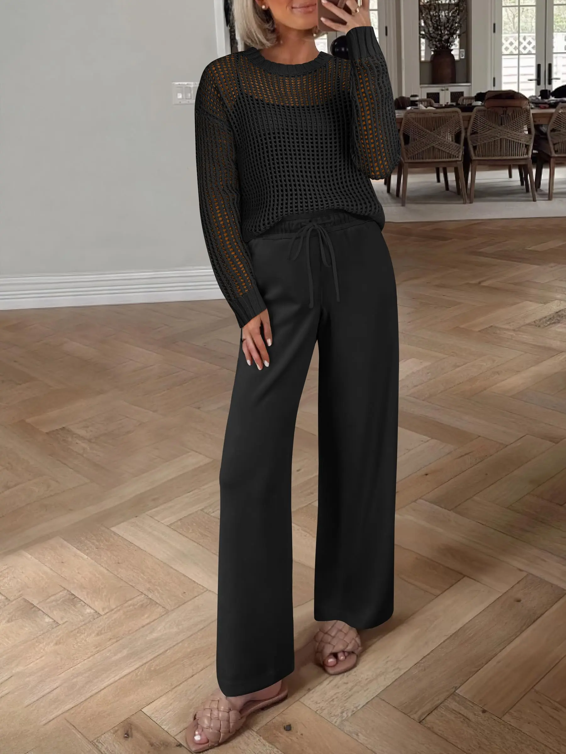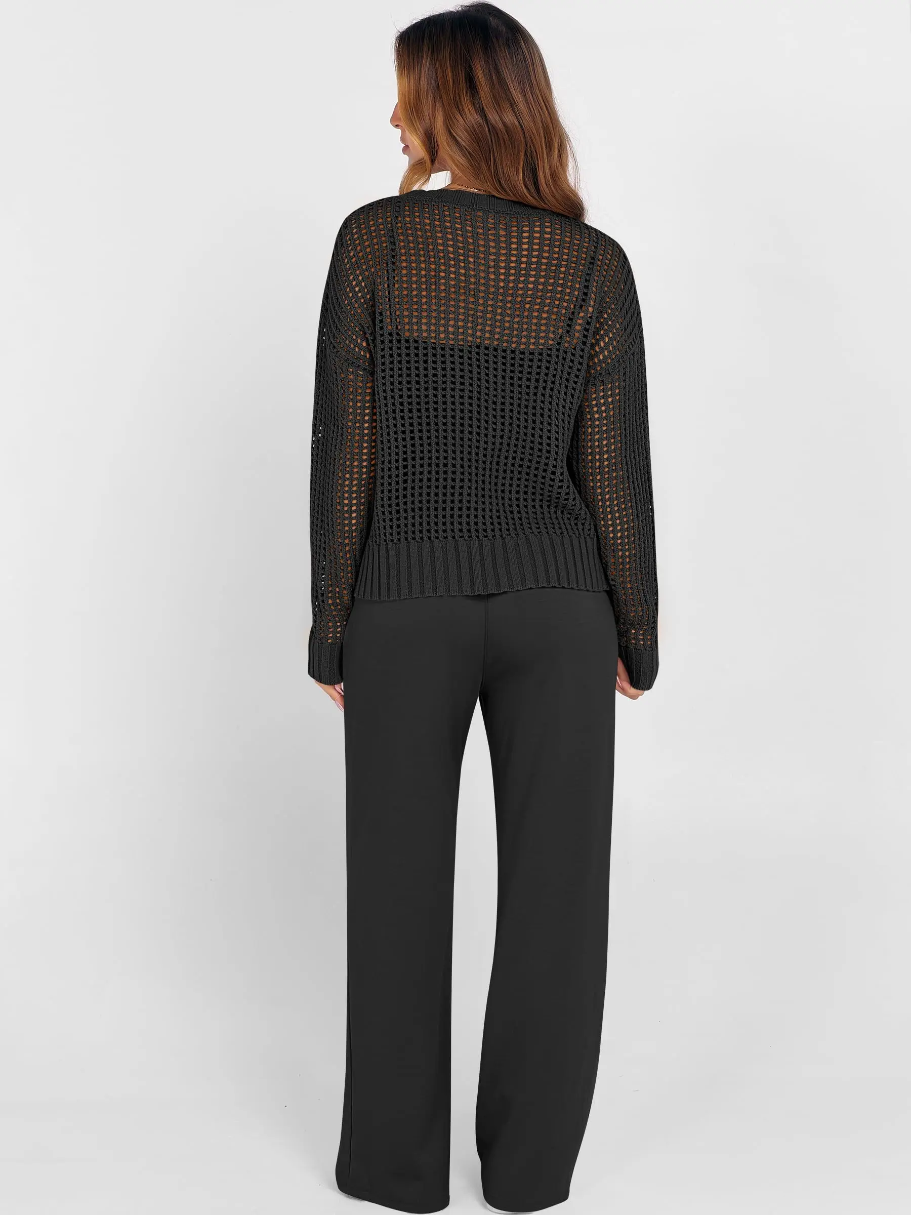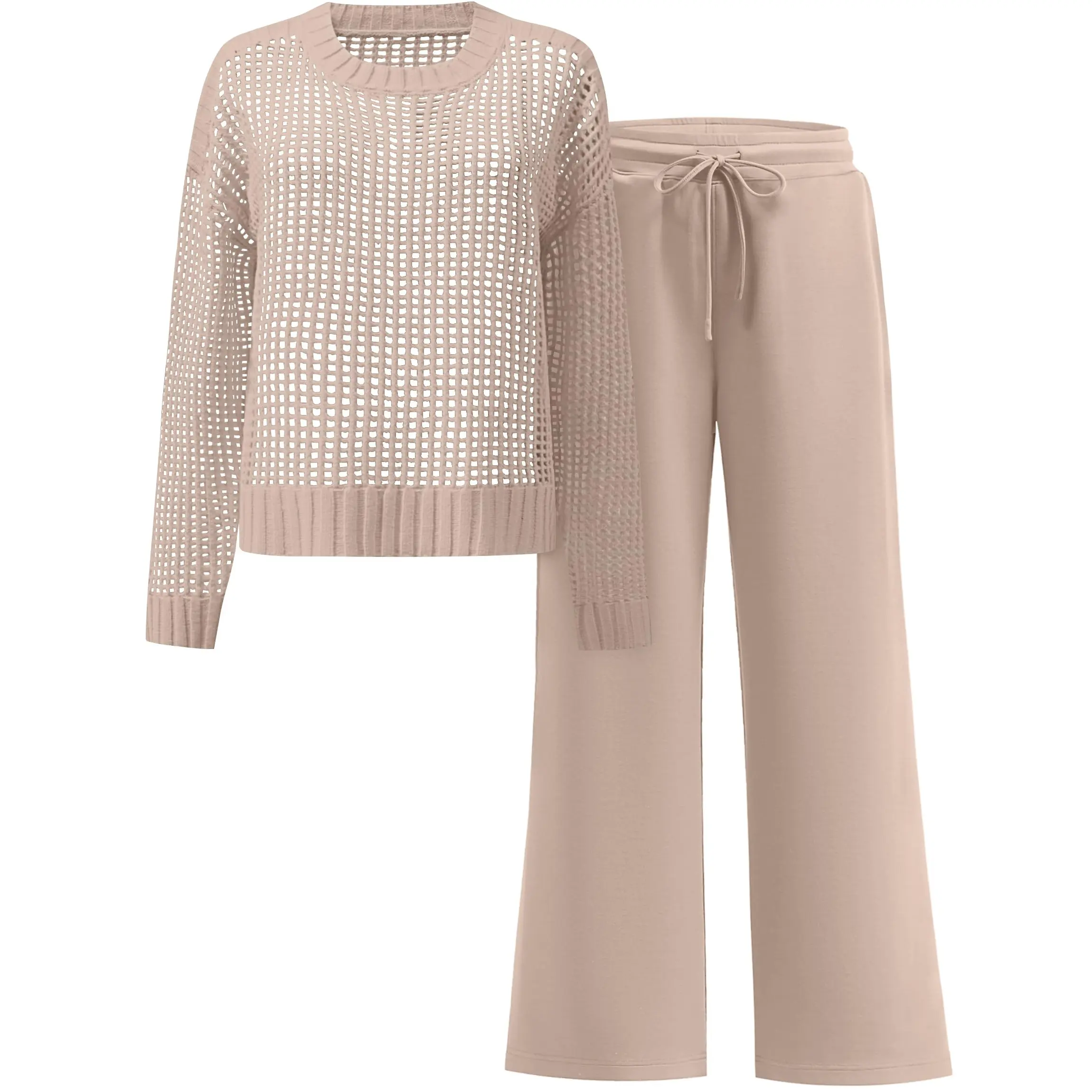 ·Features - Women's Two Piece Outfits, hollow-carved design, crew neck, sheer pointelle stitch, long sleeve. This women's lounge set consists of a sweater top and wide-leg pants; it is suitable for daily wear, work, office, business, and vacation.