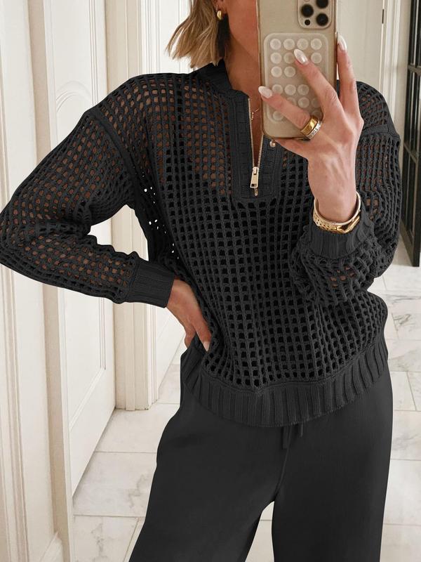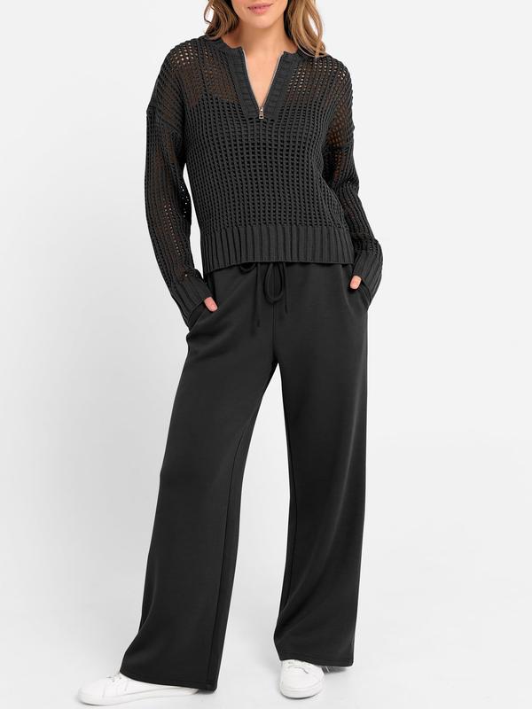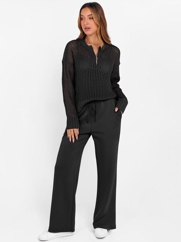 ·Features - Fall outfits for women, hollow-carved design, half zip neck, sheer pointelle stitch, long sleeve, wide leg pants. This women's lounge travel set is perfect for daily wear, work, office, business, vacation.