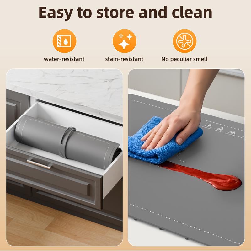 ·Space-Saving Roll-Up Portability:Maximize convenience with its ultra-thin 3mm profile. The flexible, food-grade silicone mat rolls up tightly for compact storage in any drawer or bag. Take it effortlessly to parties, trips, or use it daily without cluttering your space.