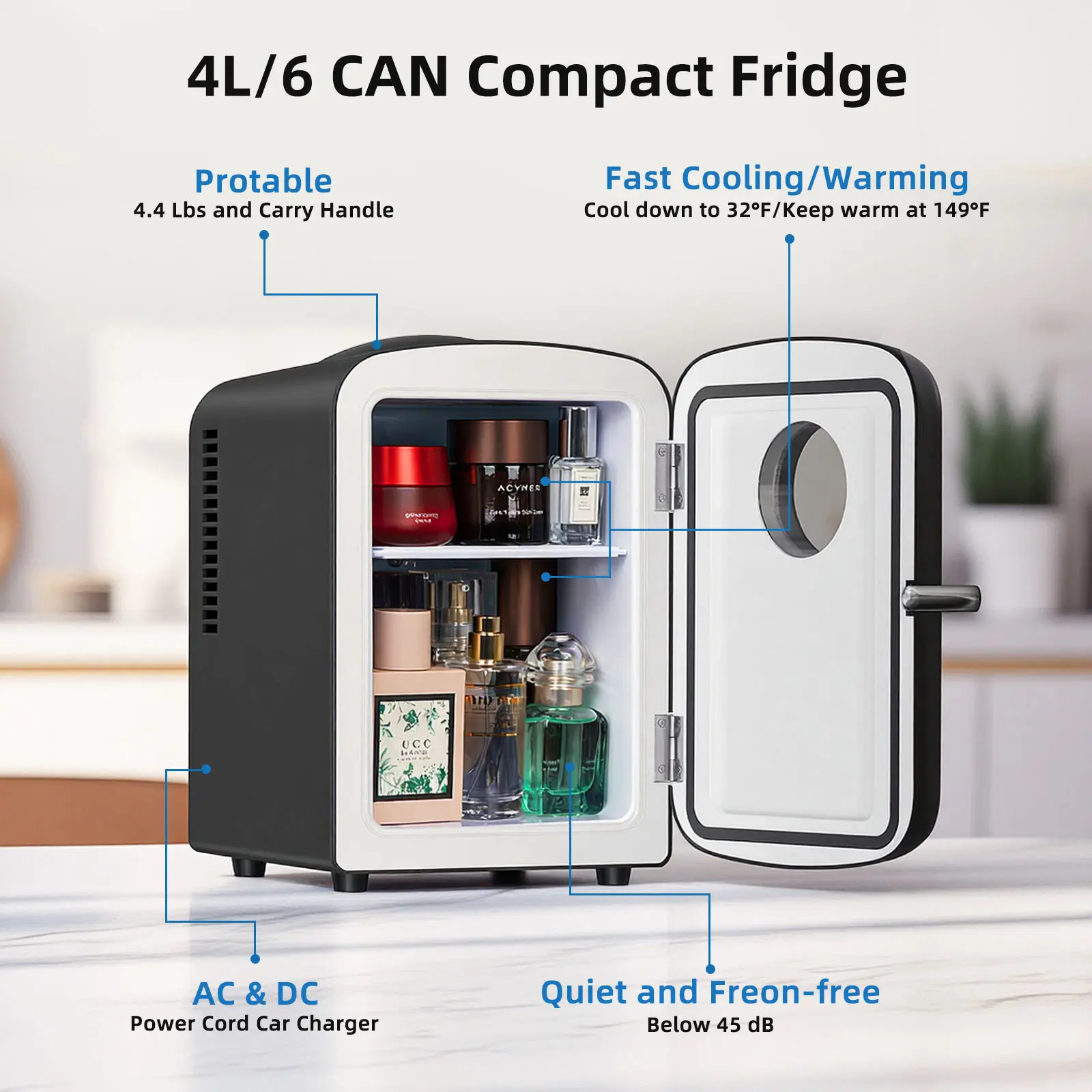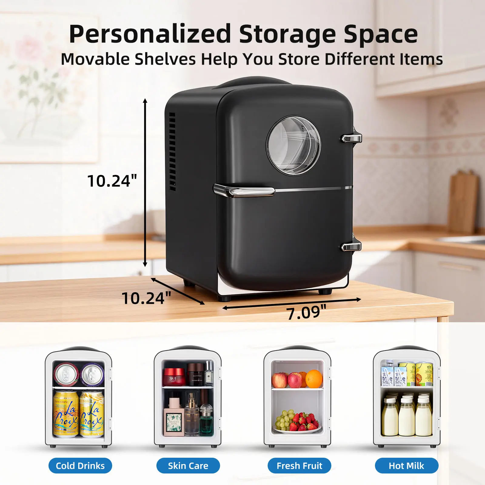 ·Compact & Portable Black Design: With its sleek black finish and compact dimensions of only 10.63 x 10.43 x 7.09 inches (LxWxH), this 4-liter capacity fridge fits perfectly in tight spaces like cup holders, car seats, nightstands, or on your desk without taking up valuable room.