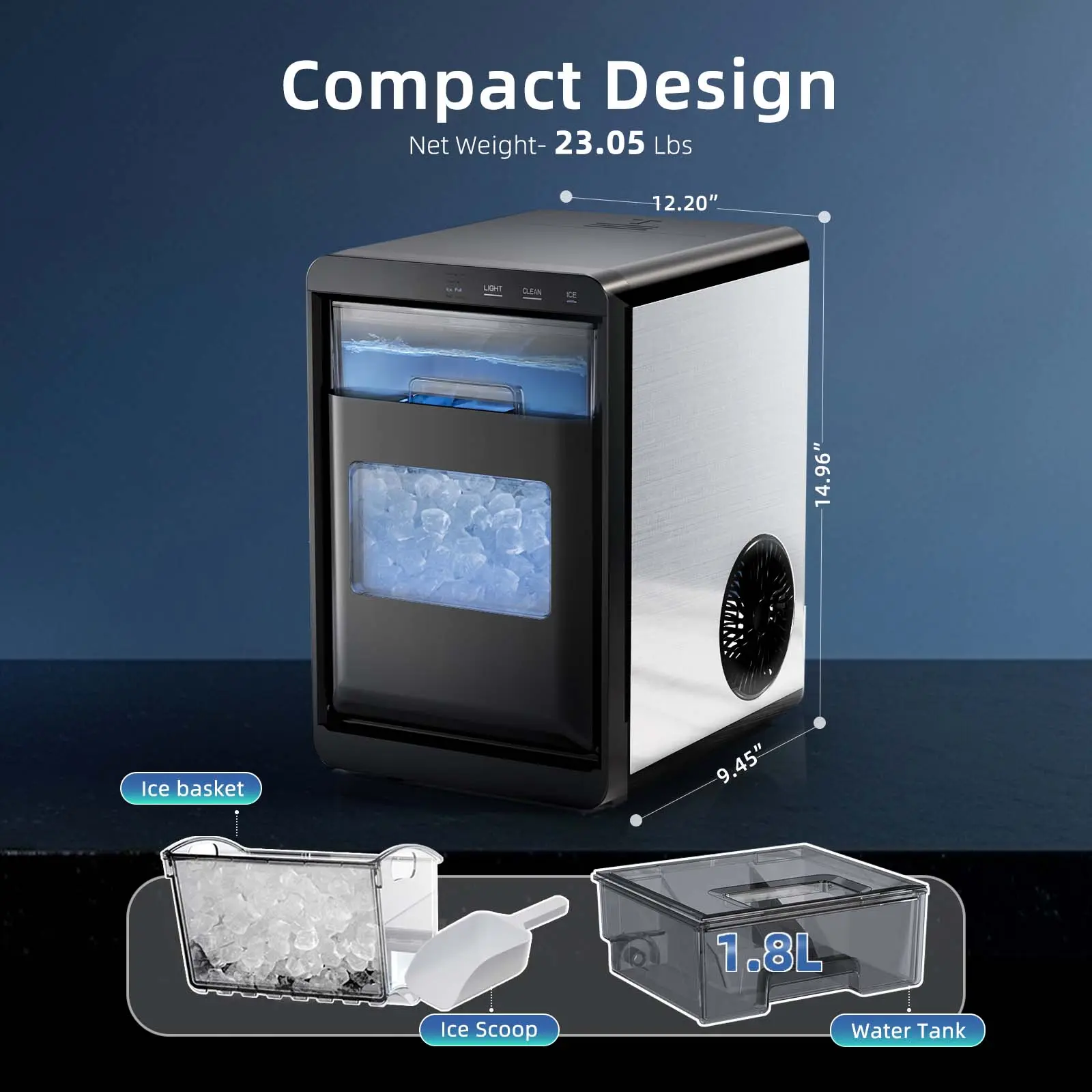 📦 Compact & Portable Design with Large Storage 📦- Compact dimensions (9.45"D×12.20"W×14.96"H).- Features a 1.8L water tank and 1.2kg ice storage bin.- Lightweight and space-saving, fitting seamlessly in kitchens, RVs, bedrooms, offices, or outdoor gatherings.