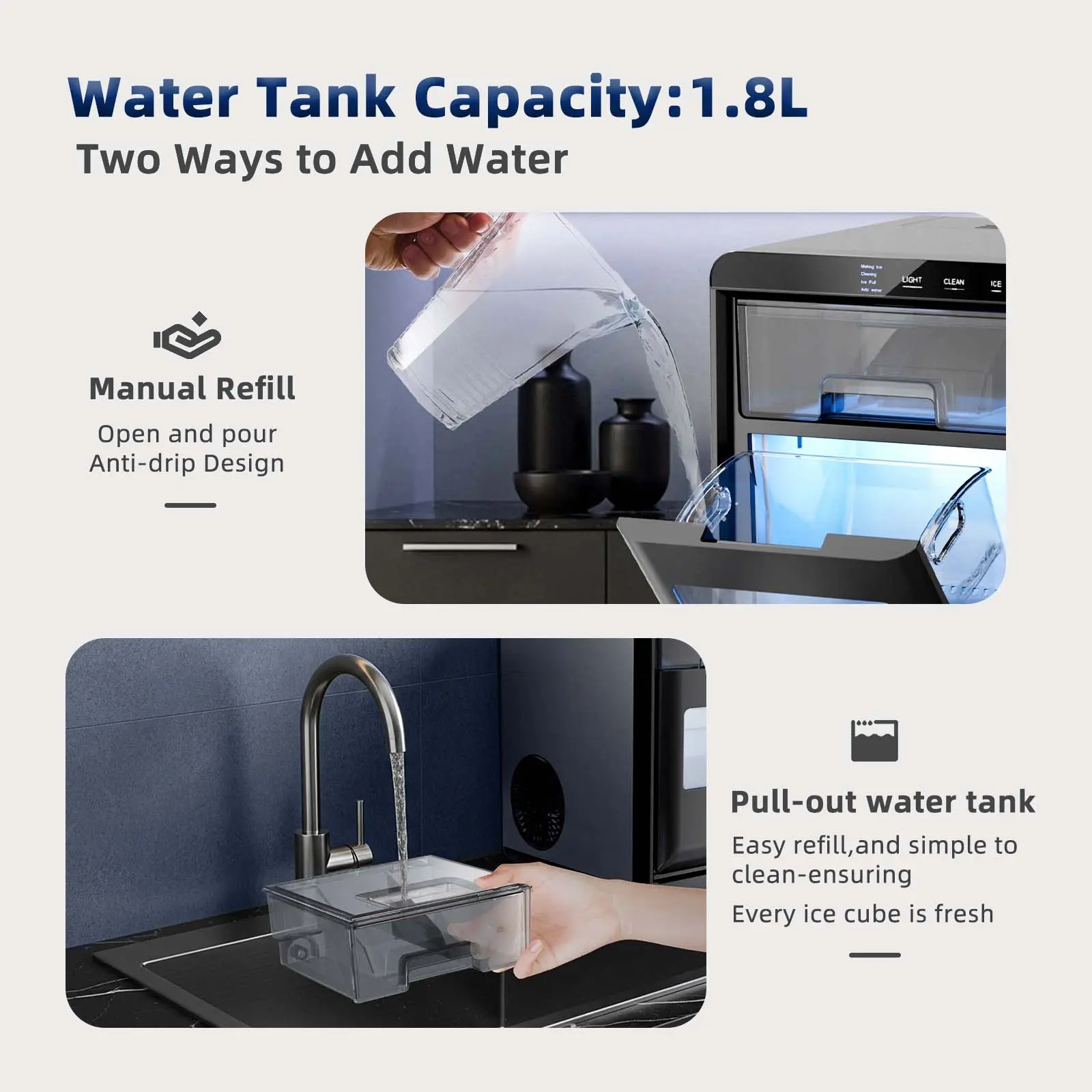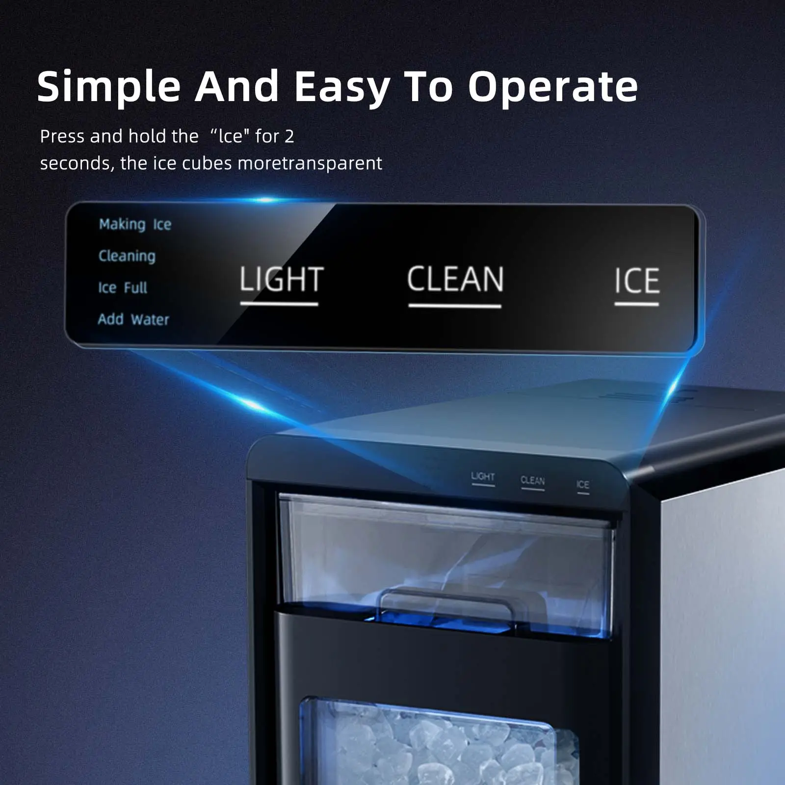 💡 Smart Alerts & One-Touch Self-Cleaning 💡- Ice Full and Water Shortage indicators for hassle-free operation.- 20-minute automatic self-cleaning function for fresh, hygienic, and maintenance-free operation.