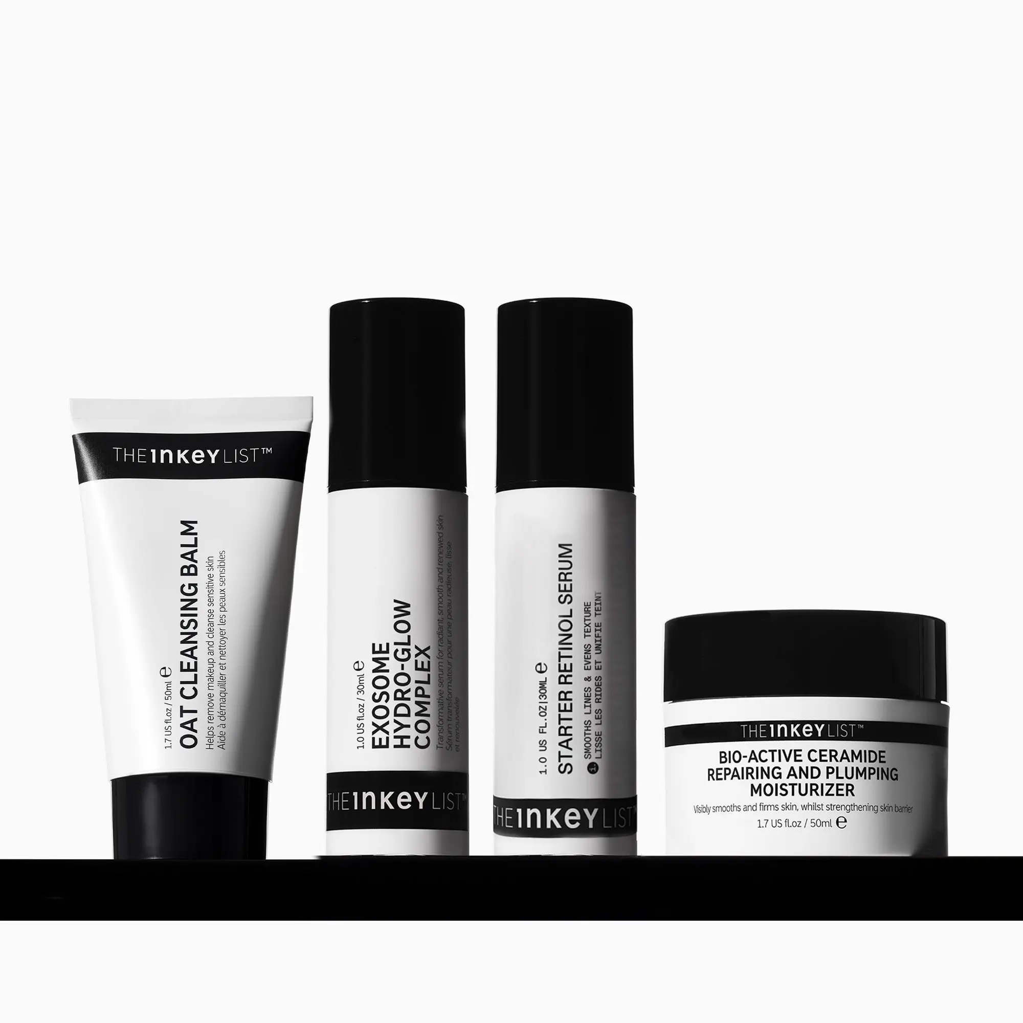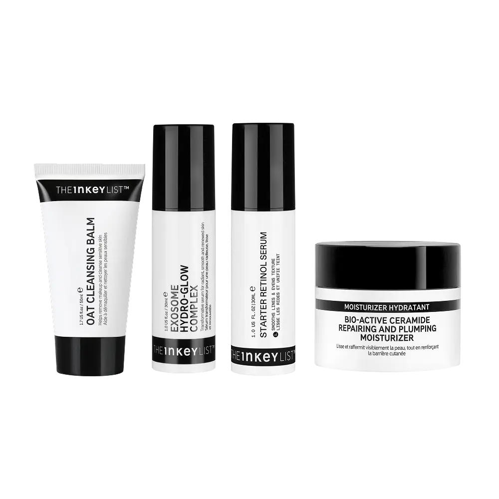 If you’ve started to notice the first signs of skin aging, perhaps a few fine lines where you didn’t used to have them, or your skin may be feeling a little slacker then now is the ideal time to switch up your skincare. This essential 4-step routine will help hydrate, firm and plump skin, strengthen the skin’s barrier, and reduce the appearance of fine lines and wrinkles. Oat Cleansing Balm: Deeply cleanse and dissolve all visible traces of makeup including waterproof and long-wear products. Exosome Hydro-Glow Complex: Get rejuvenated skin in just 14 days with this collagen-boosting serum. With a creamy, lightweight texture it effortlessly sinks into the skin without tackiness, and layers perfectly under other skincare and makeup. Suitable for both AM and PM use. Starter Retinol Serum: A gentle yet effective beginner Retinol serum, clinically proven to visibly smooth fine lines in just 7 days -without irritation*. Bio-Active Ceramide Moisturiser: Powered by Bio-Active Ceramides for up to 4X visible fine line and wrinkle reduction, this rich, velvety, anti-ageing moisturiser defends against visible signs of skin ageing.