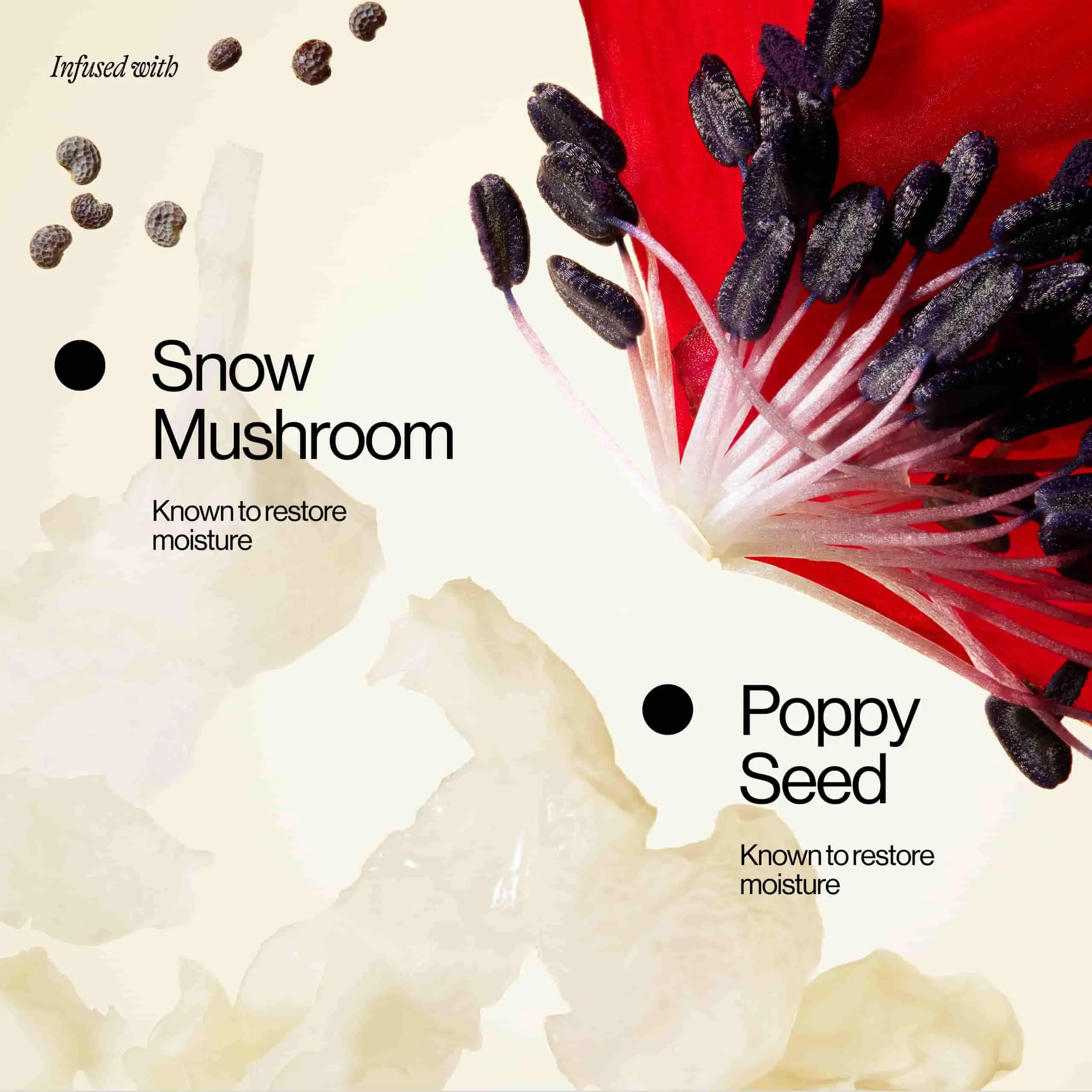 | Ingredients | Water, Capryloyl Glycerin/Sebacic Acid Copolymer, Cetearyl Alcohol, Glycerin, Ethylhexyl Olivate, Neopentyl Glycol Diheptanoate, Butyrospermum Parkii (Shea) Butter, Ricinus Communis (Castor) Seed Oil, Tremella Fuciformis (Snow Mushroom) Extract, Papaver Somniferum (Poppy) Seed Oil, Linum Usitatissimum (Flax) Seed Oil, Vitis Vinifera (Grape) Seed Oil, Olea Europaea (Olive) Fruit Oil, Crambe Abyssinica Seed Oil, Squalane, Arginine, Aspartic Acid, Glycine, Alanine, Serine, Valine, Isoleucine, Proline, Threonine, Histidine, Phenylalanine, Polyquaternium-37, Behentrimonium Chloride, PCA, Isododecane, Dimer Dilinoleyl Dimer Dilinoleate, Propylene Glycol, Quaternium-80, Ethylhexylglycerin, Sodium PCA, Sodium Lactate, Acetic Acid, Phenoxyethanol, Fragrance |