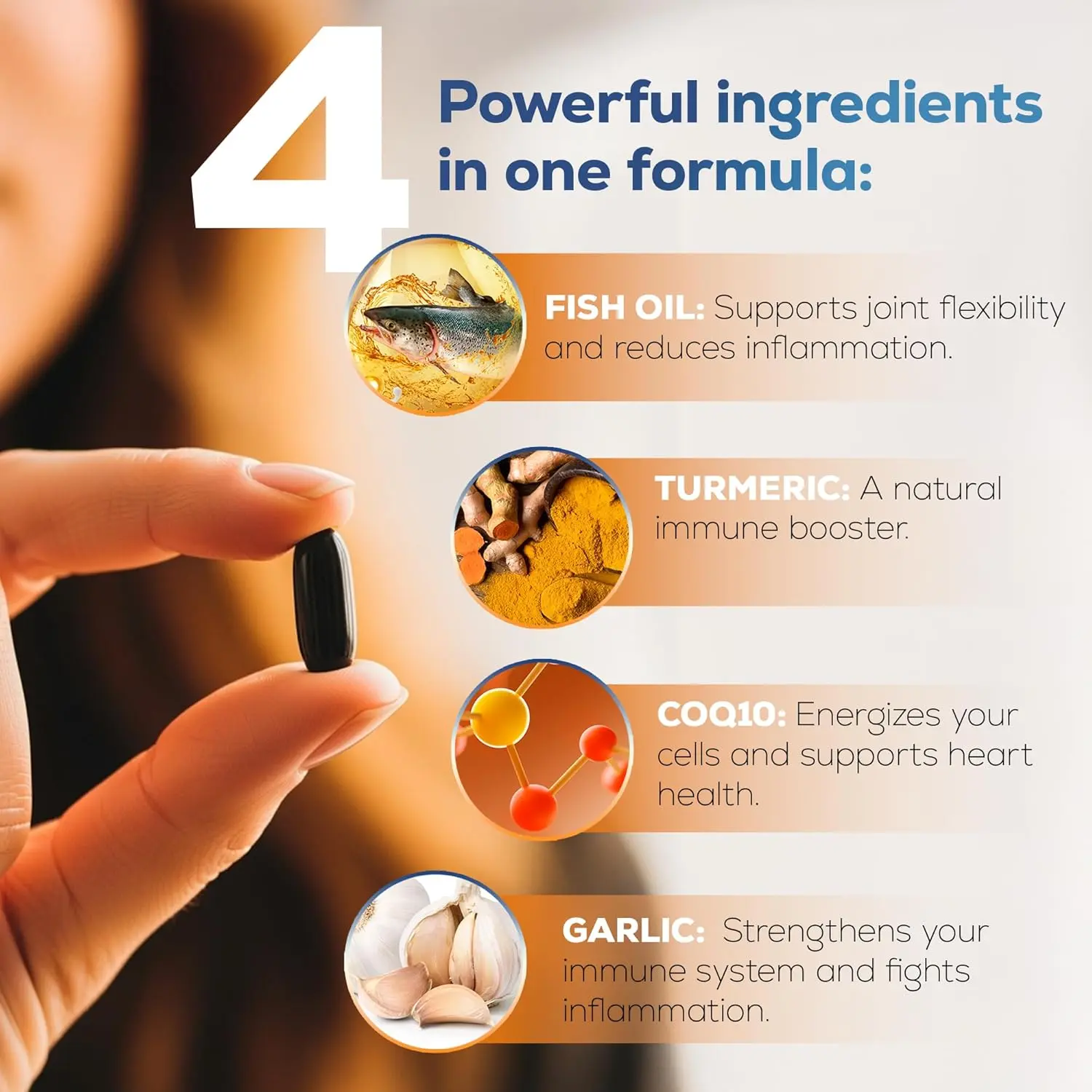 • Combines Omega-3 (EPA & DHA) with CoQ10, Turmeric, and Garlic for daily wellness support.