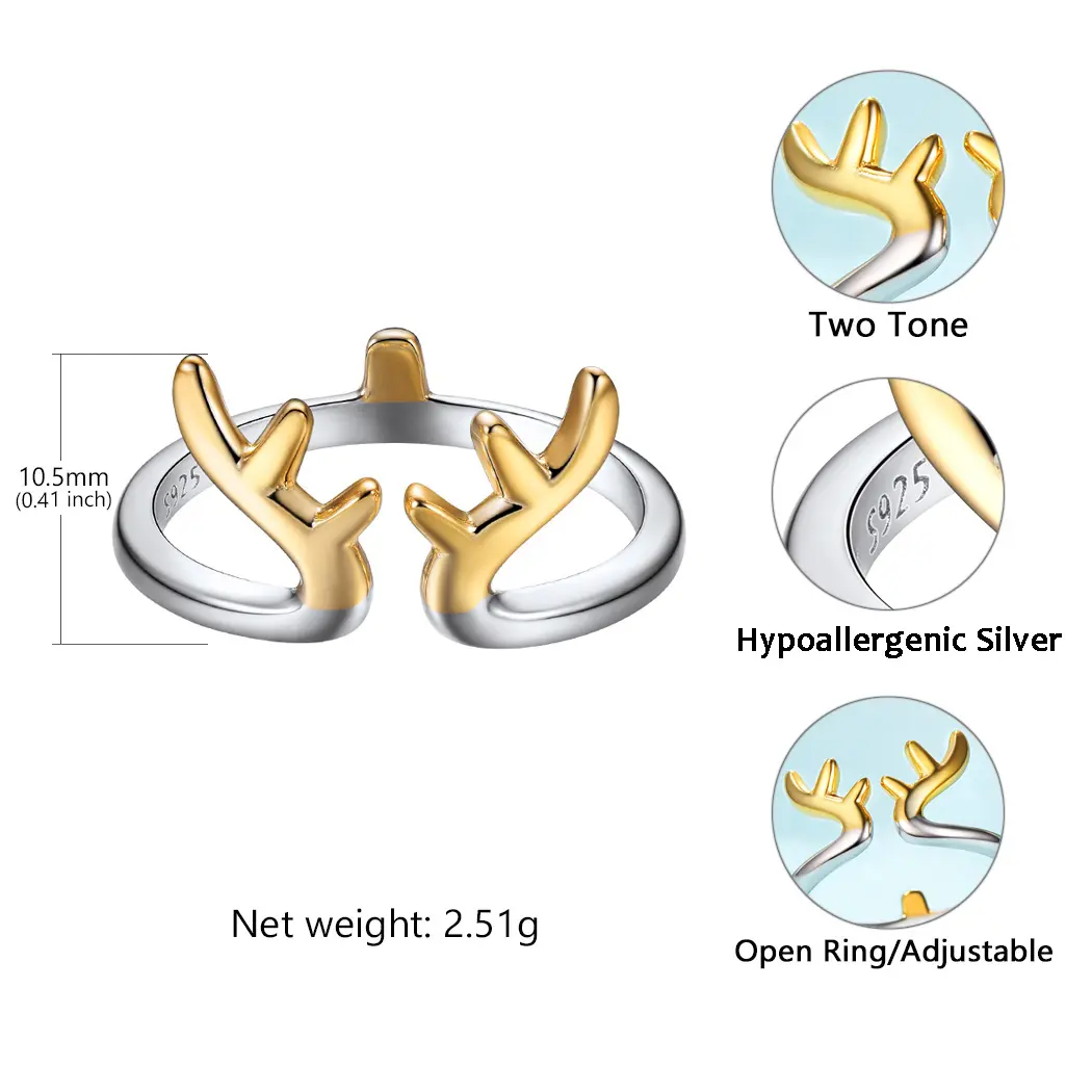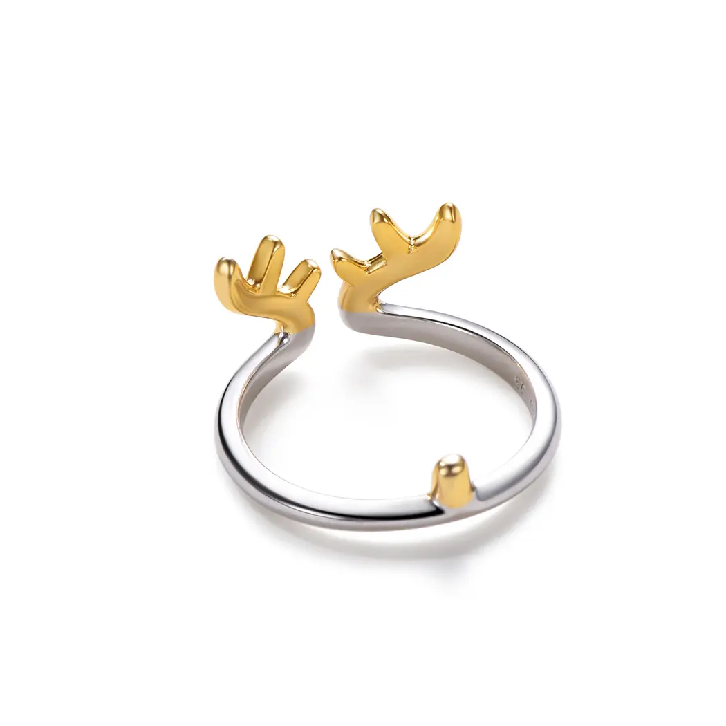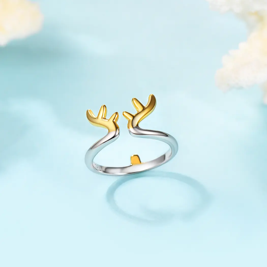 Sophisticated Antler Ring – A modern masterpiece that seamlessly blends design and elegance. Crafted with precision, this dual-tone ring features polished golden antlers set against a sleek silver band. Ideal for those who appreciate unique aesthetics