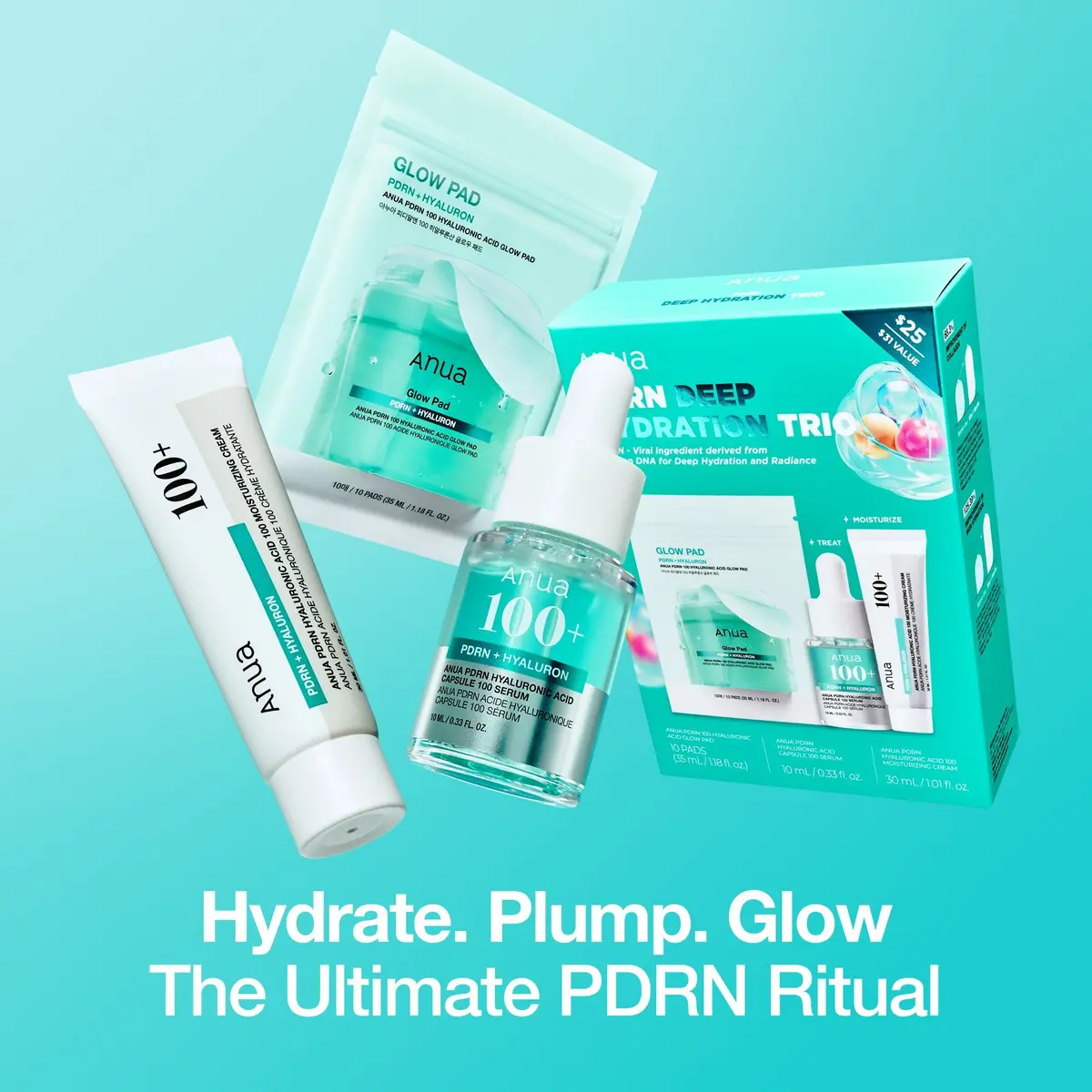 The Anua PDRN Deep Hydration Trio is a 3-step trial kit featuring a toner pad, serum, and moisturizer to help you achieve a glass-skin glow powered by the viral ingredient, PDRN.