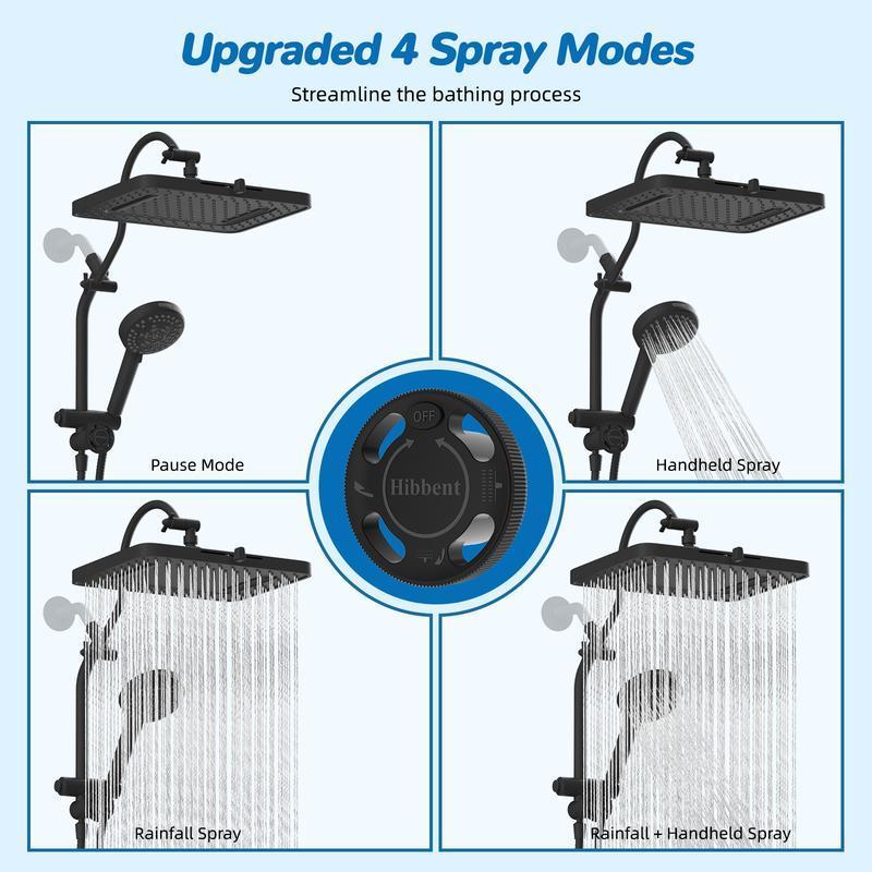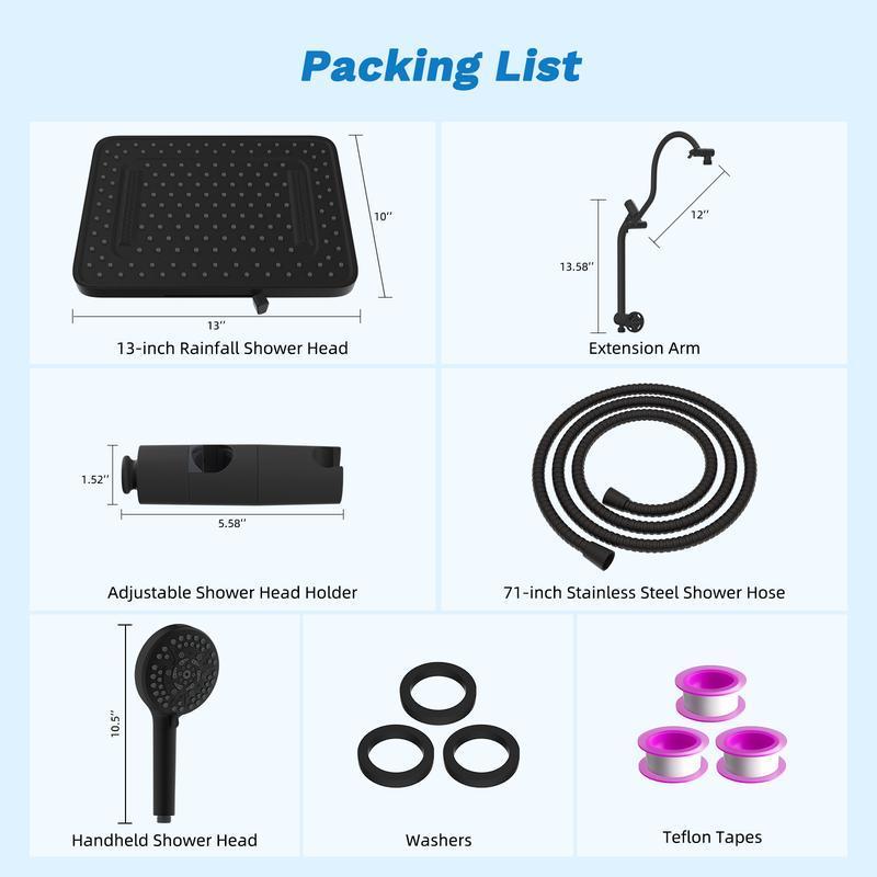 [Upgraded 5 Spray 13" Rainfall Shower Head] This showerhead combo includes a high-quality plastic rainfall shower head, an ABS 10-function handheld shower, a all metal 4-way shower arm, a 71-inch stainless steel water hose, an ABS showerhead holder, as well as installation tools and a detailed instruction manual. It offers greater coverage than traditional models to deliver a dynamic, high-pressure massage experience, ensuring a lavish shower even in low-water pressure areas. You can switch to the 8-inch powerful massage mode to eases sore muscles. Plus, the one-touch water stop making it easy to apply shower gel or rinse off.