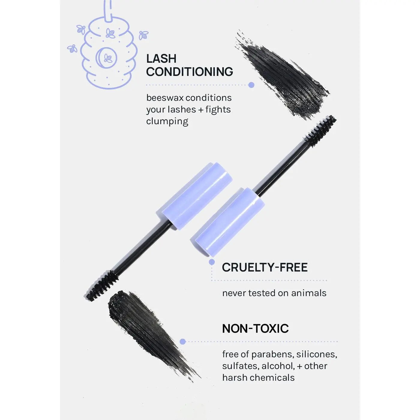 LAYER-ON EXTRA LASHES: formulated to make lashes look longer + thicker for the look of falsies without the extra tools or time. Non-toxic, with lash conditioning beeswax for fewer clumps.