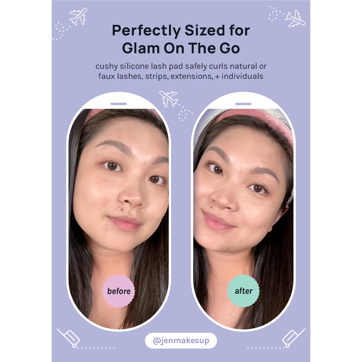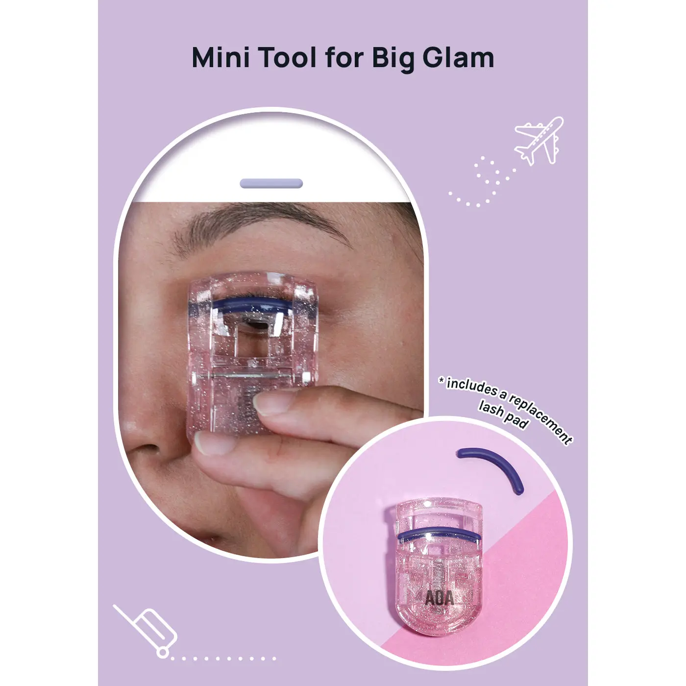 This mini eyelash curler is the perfect size for glam on the go. The soft, cushy lash pad safely curls natural, or faux lash extensions, individuals, + strips.