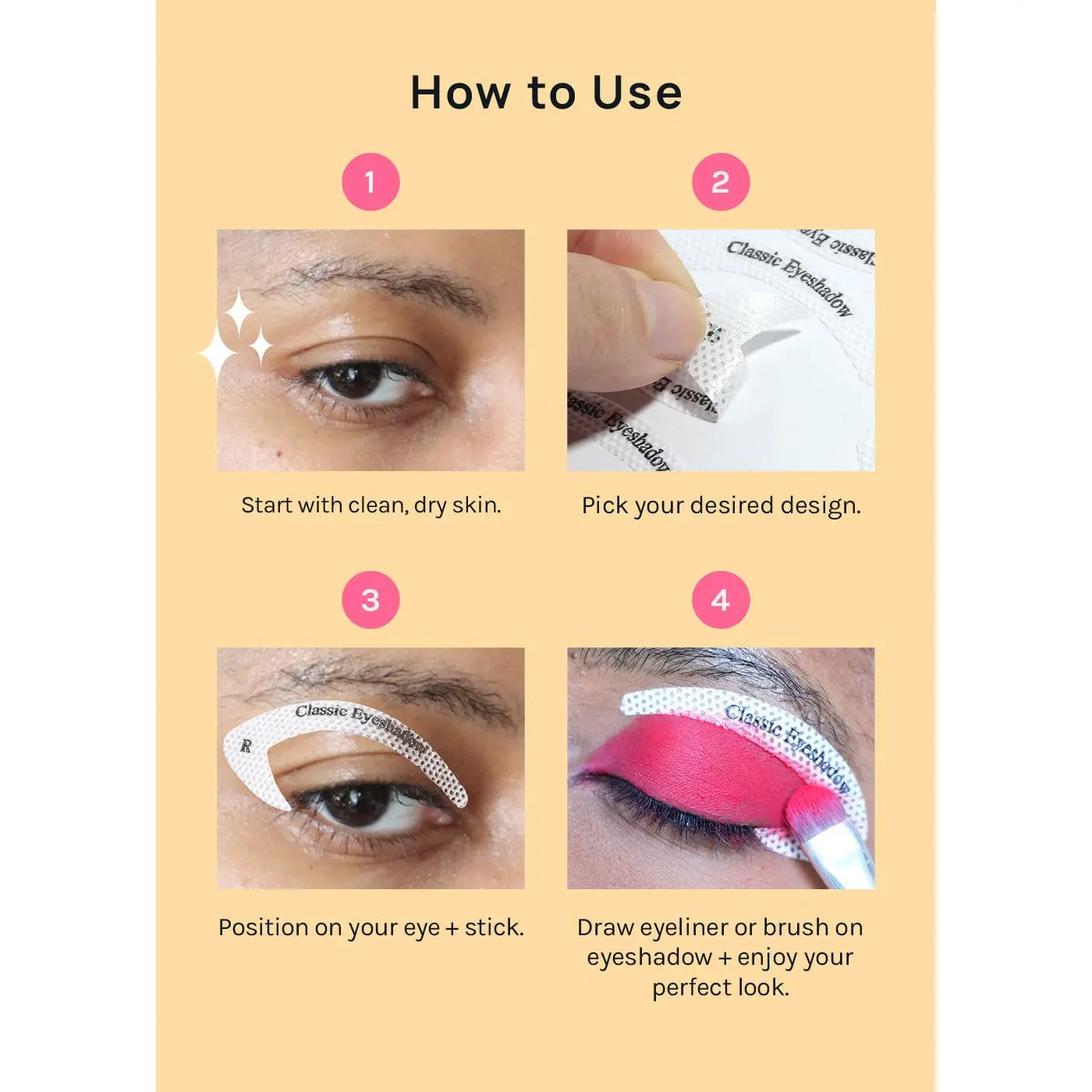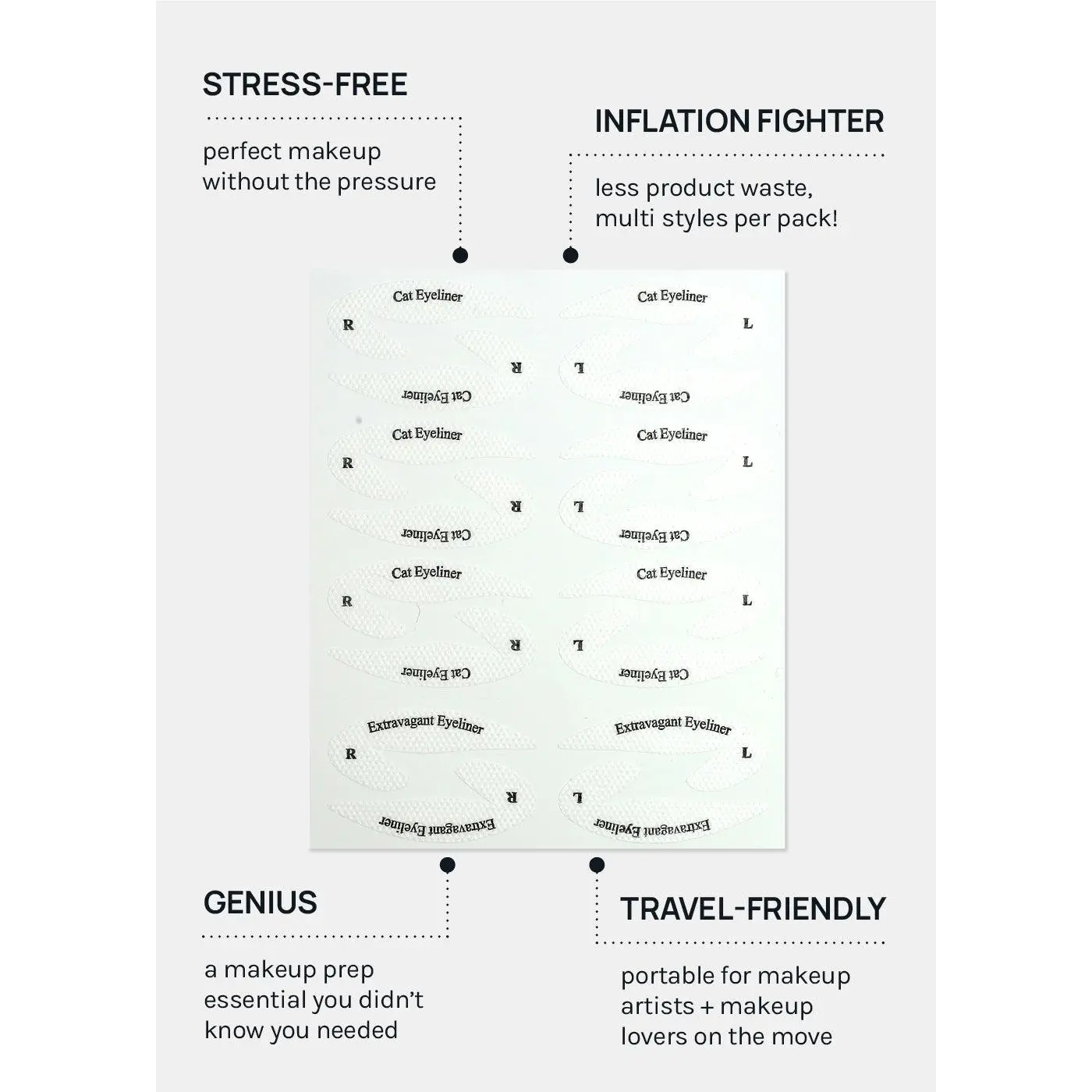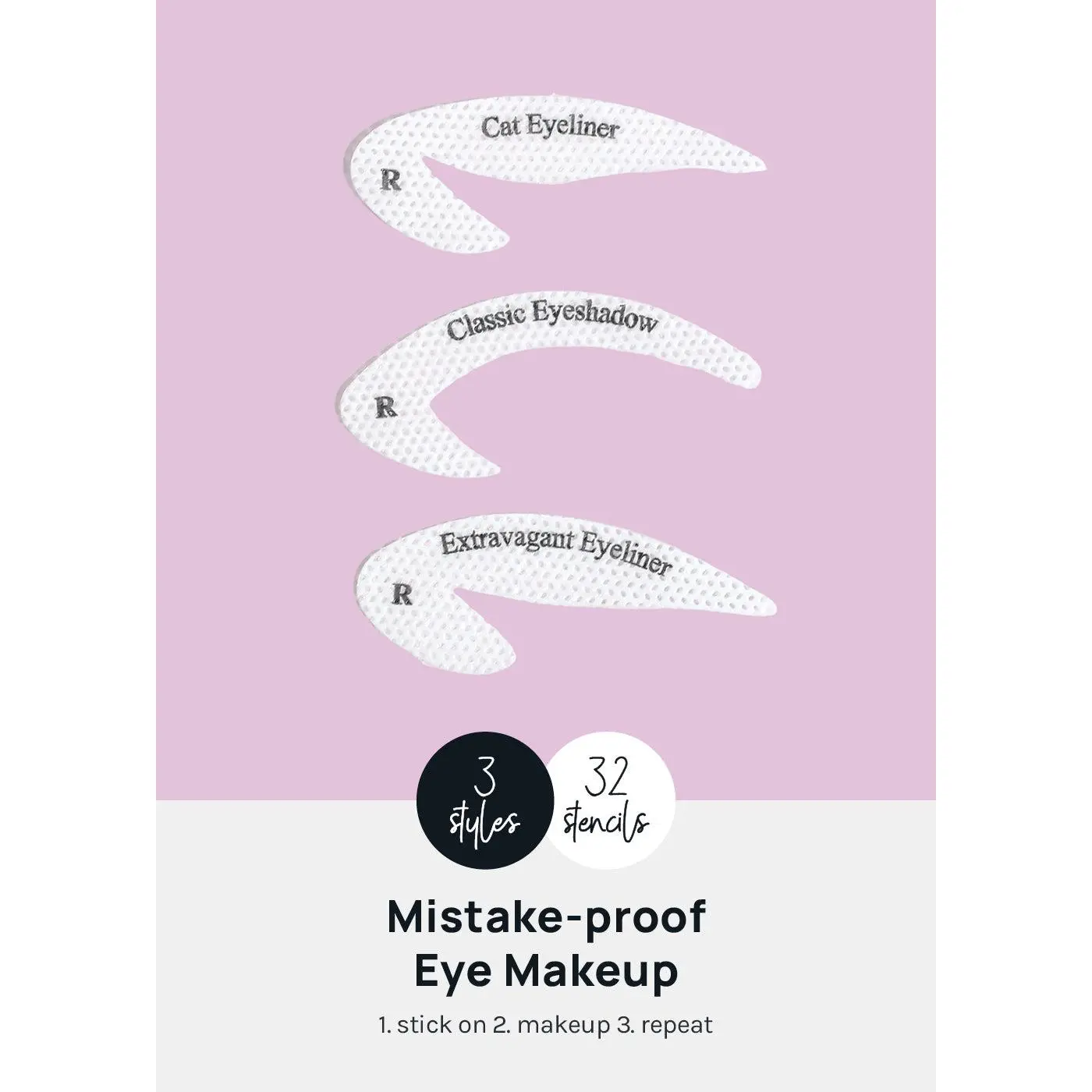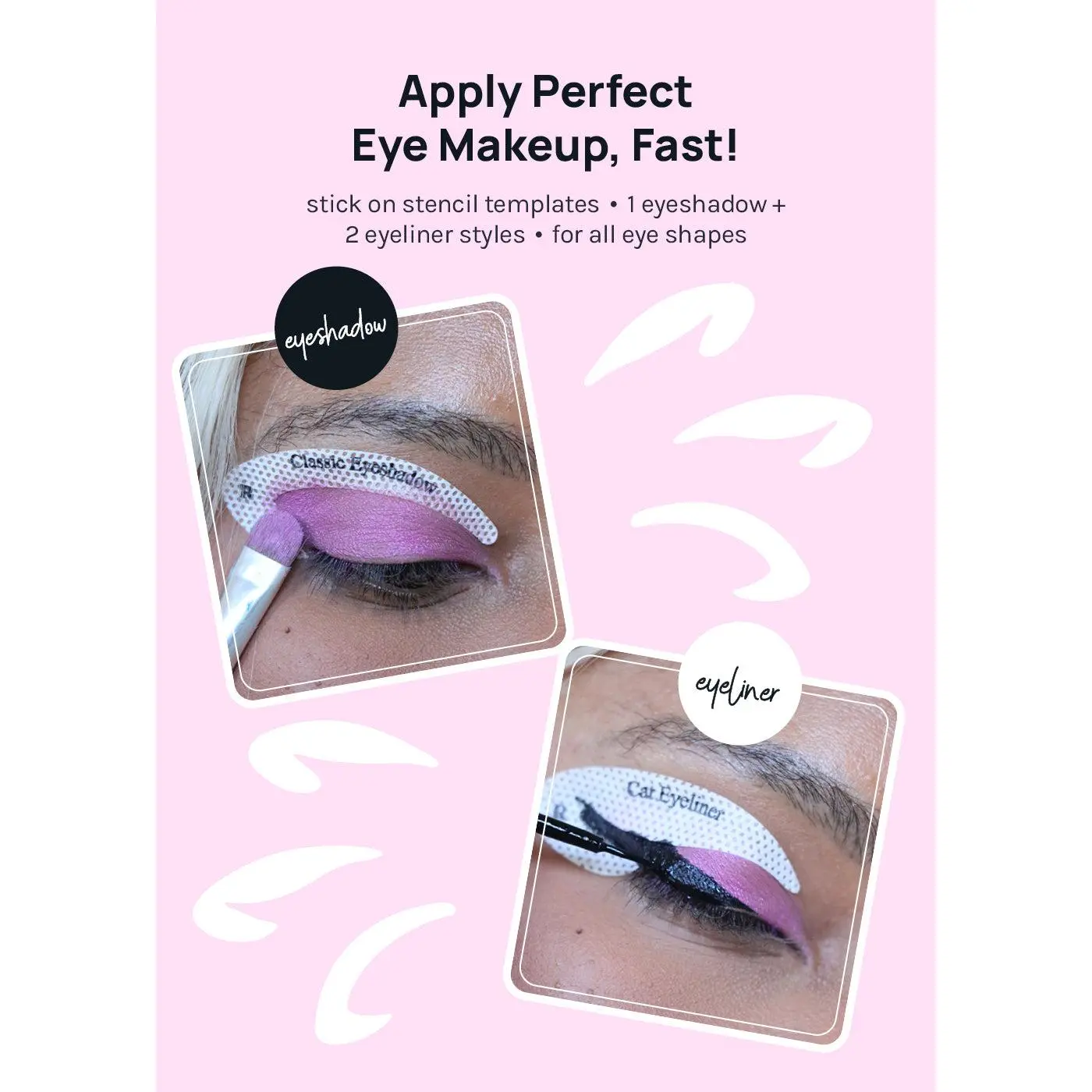 3 styles • 1 eyeshadow + 2 eyeliner styles • 36 Stick-on Stencils
