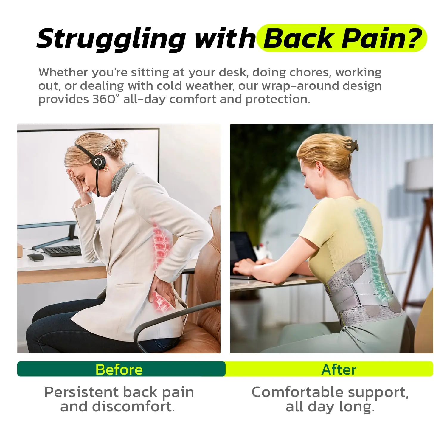 360-degree Biochemical Hug Support: Experience unparalleled support with our BackBrace featuring a 360-degree hug desian that evenly distributes lumbar pressure and reducesspinal load.