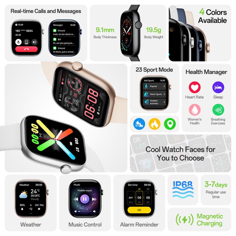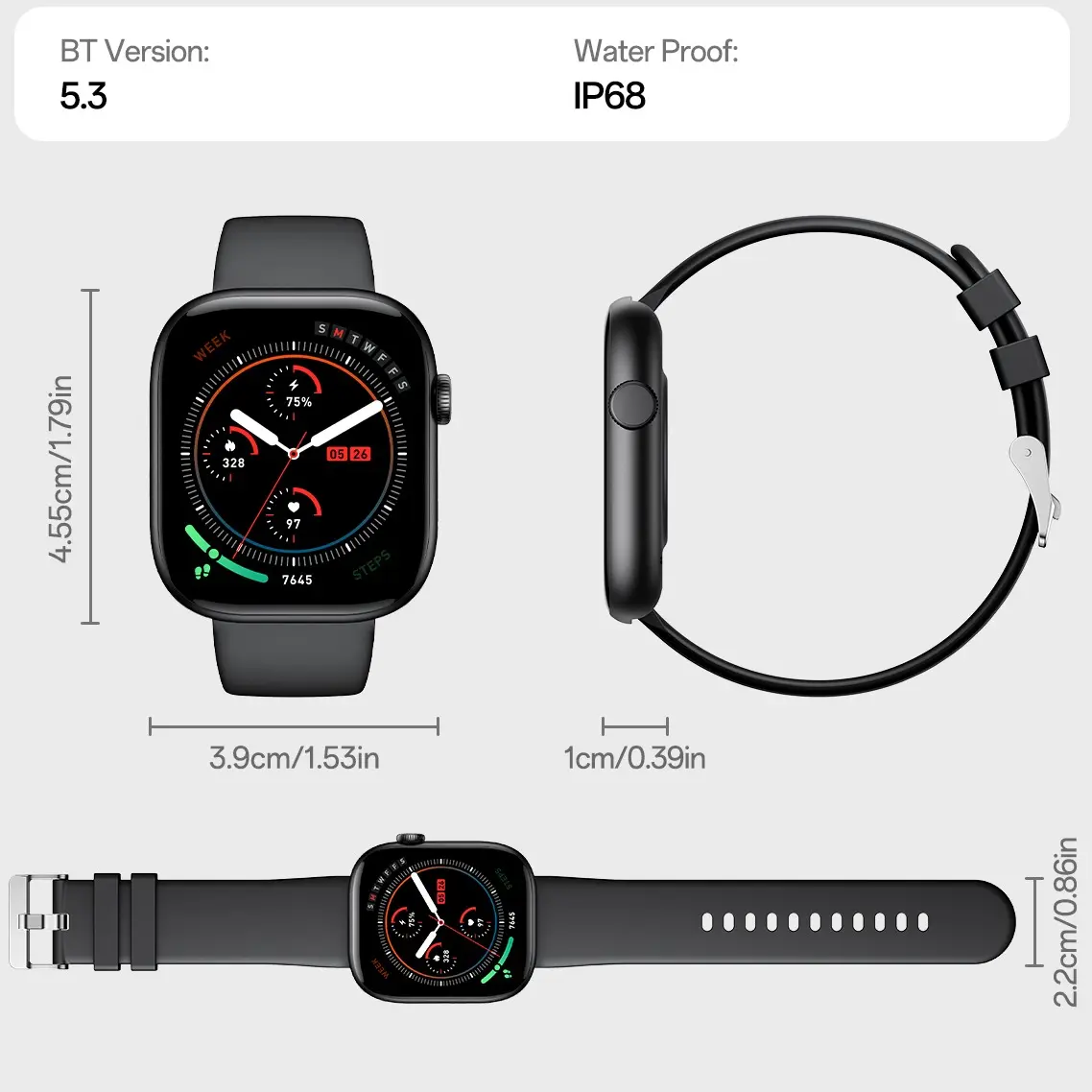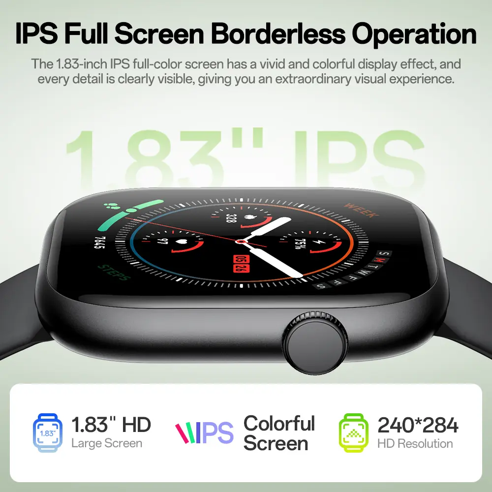 Dive into a visual feast with the 1.83'' IPS colorful full screen. It boasts a generous 1170mm² display area, delivering vibrant, true-to-life colors. The seamless borderless design lets you swipe, tap, and navigate effortlessly. This watch is a visual delight for your daily activities.