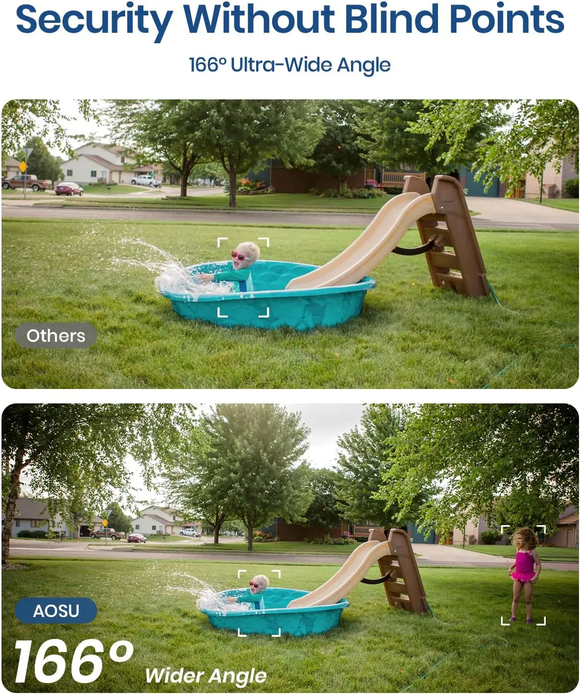 ·AOSU security camera system with 5MP picture quality which is improved by 67% from 3MP(2K) video, and captures clearer details whether day or night.