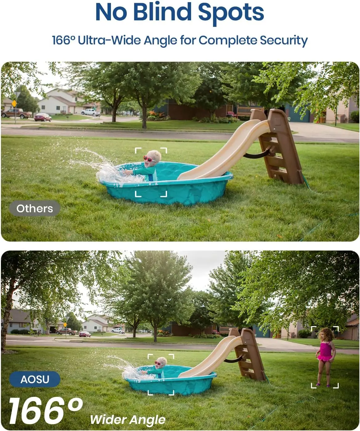 aosu WirelessCam Pro adoptes 7 pieces of advanced ultra-clear and wide angle lens to cover every corner without any blind spots, providing an ultra-wide view of your property, and maximum correcting the image to remove fisheye distortion.