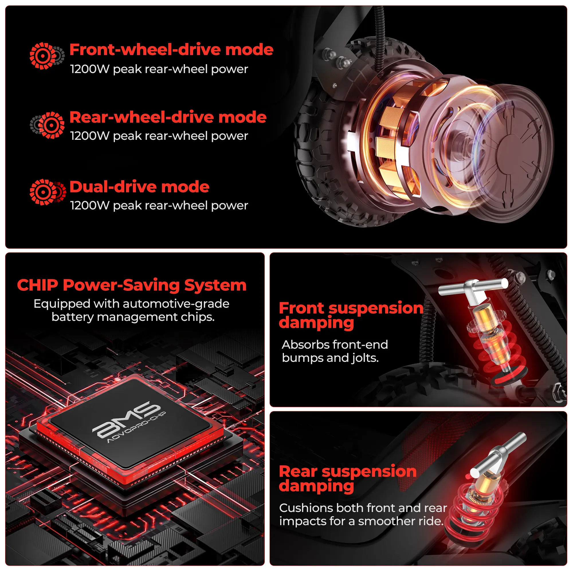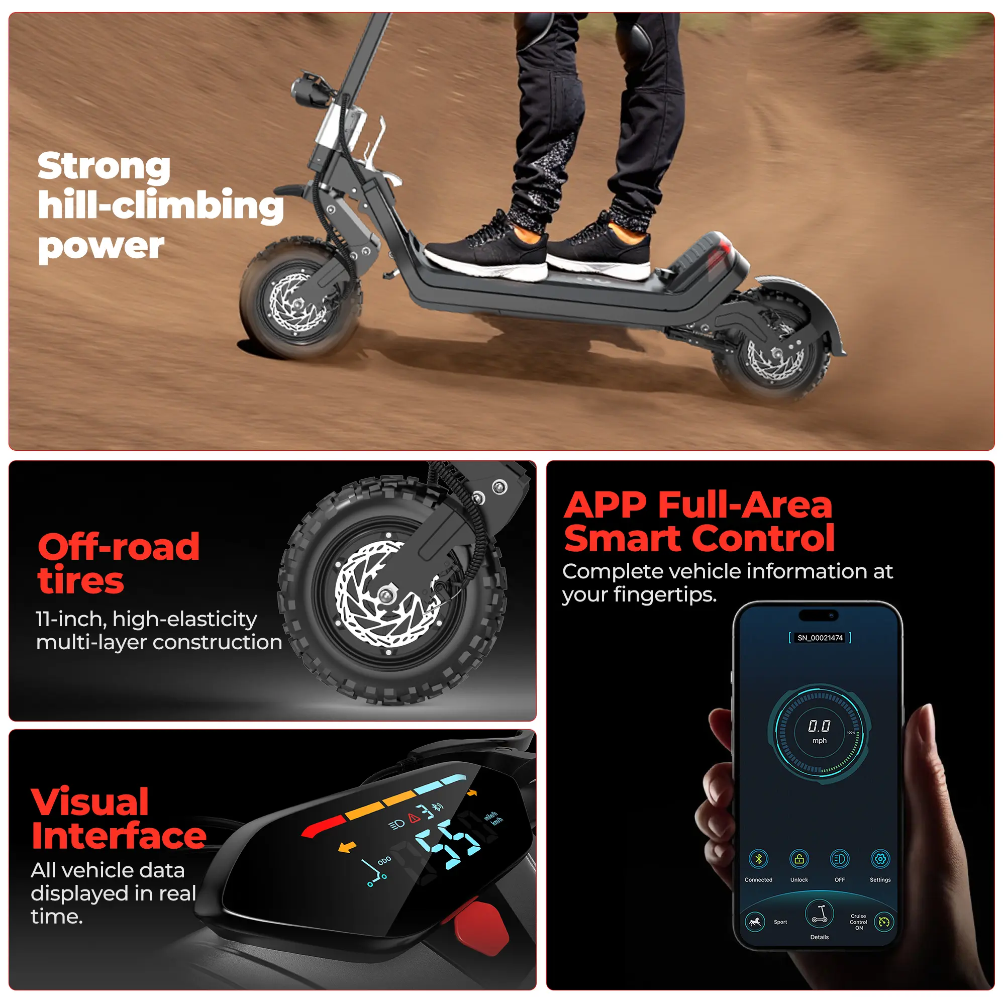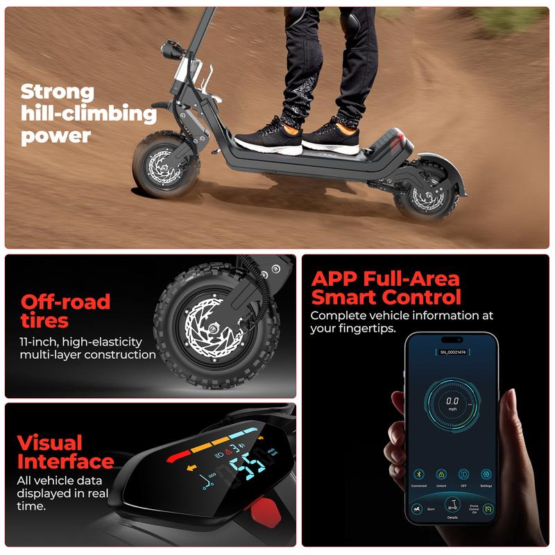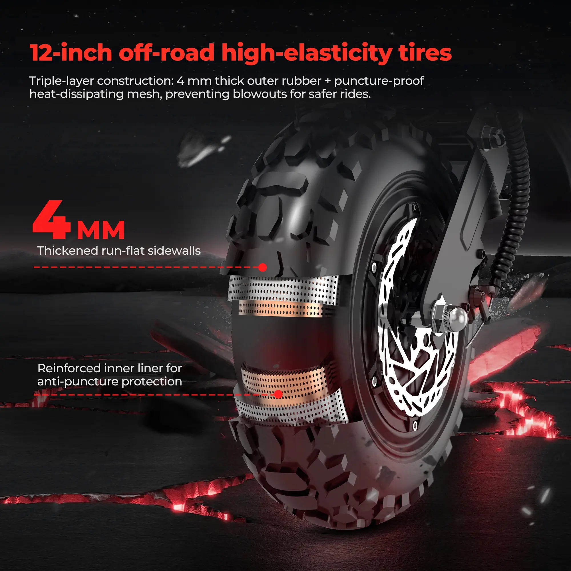 ·11-inch off-road high-elasticity tires with triple-layer protection: 4mm thick outer rubber, puncture-proof, and heat-resistant mesh.