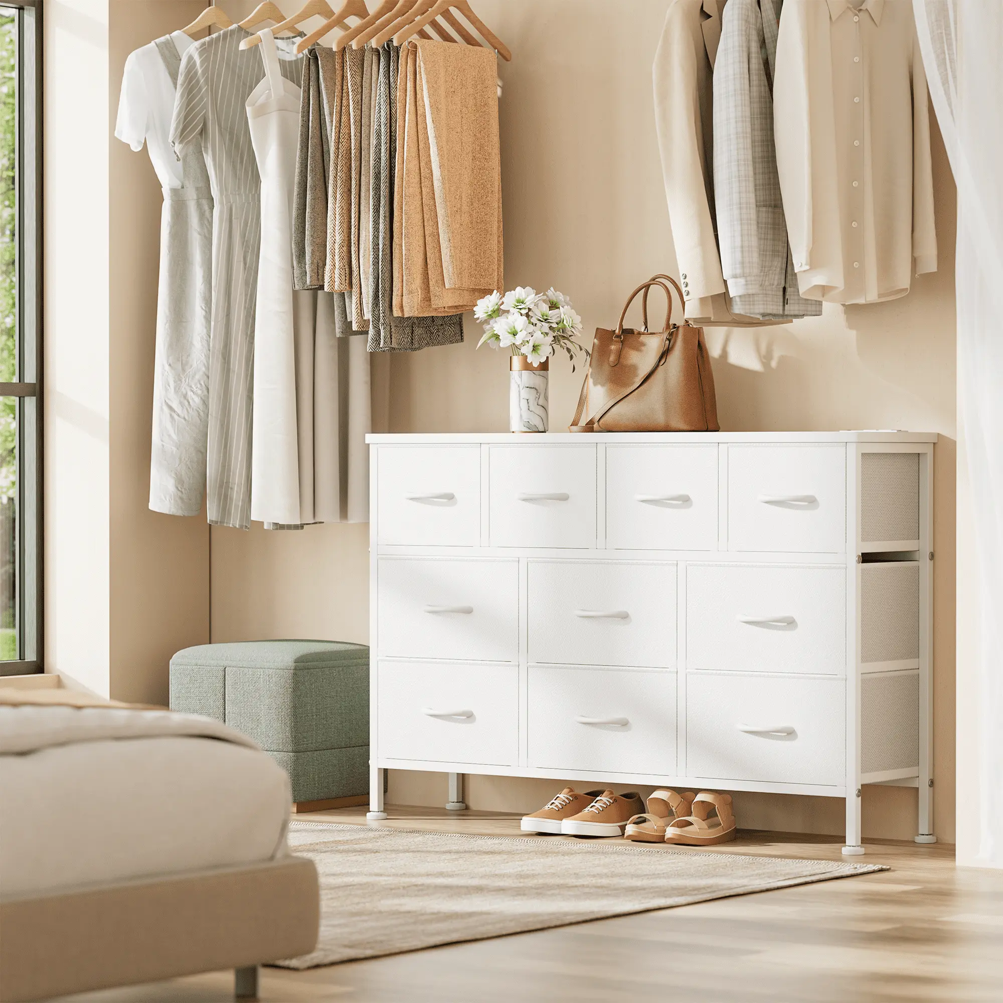[Diversified Storage Space]: Ten drawers with two different sizes can meet your needs for categorized storage of various daily necessities. 9.84'' L x 11.81" W x 8.26" H medium-sized drawer can store 20+ books or 10+ cosmetic products and so on; 13.38'' L x 11.81" W x 8.26" H large drawer can store 10+ pieces of bedding such as sheets, duvet covers, blankets, etc.