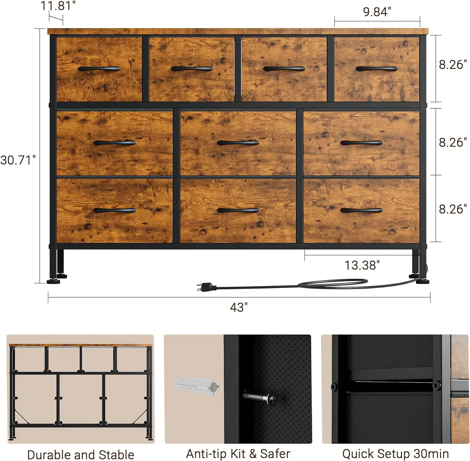 [ 10 Drawers TV Stand with Power Outlet]: 43'' L x 11.81" W x 30.71" H TV Stand is ideal for televisions up to 55"; Comes with its own power outlet, providing multiple charging options including: 2 AC Outlets (125V/12A), 2 USB Ports (5V/2A). The 5-Foot Power Cord is long enough for you to connect to a power source.