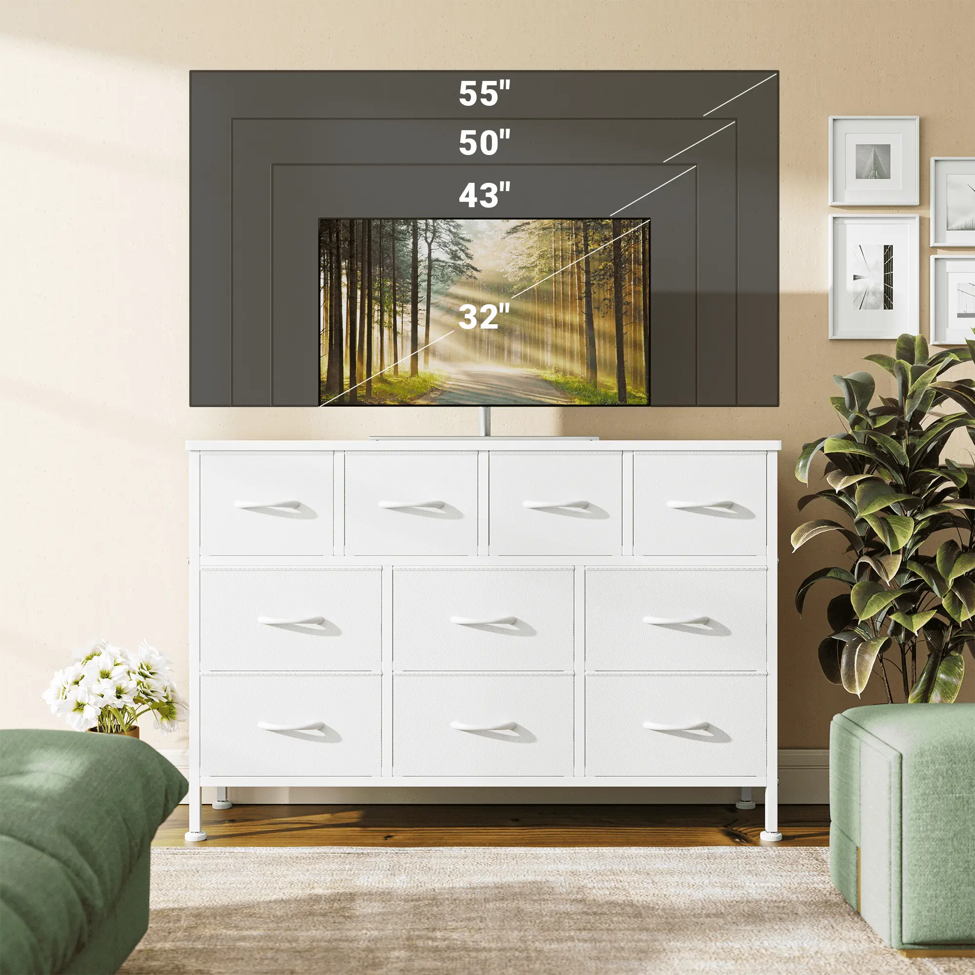 [ 10 Drawers TV Stand with Power Outlet]: 43'' L x 11.81" W x 30.71" H TV Stand is ideal for televisions up to 55"; Comes with its own power outlet, providing multiple charging options including: 2 AC Outlets (125V/12A), 2 USB Ports (5V/2A). The 5-Foot Power Cord is long enough for you to connect to a power source.