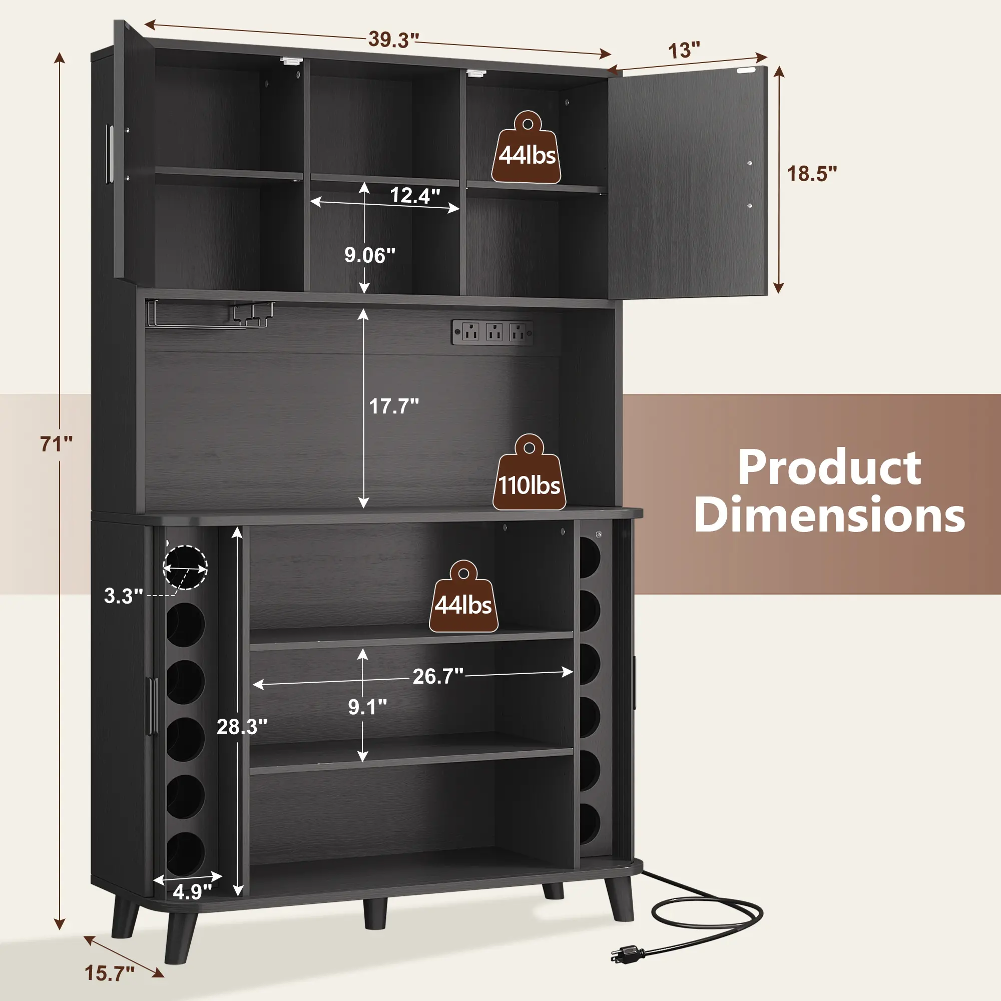 【Built-In Power Outlet】: Back-mounted outlet powers microwaves, coffee makers, juicers, and other small appliances—keeping countertops clean and clutter-free.