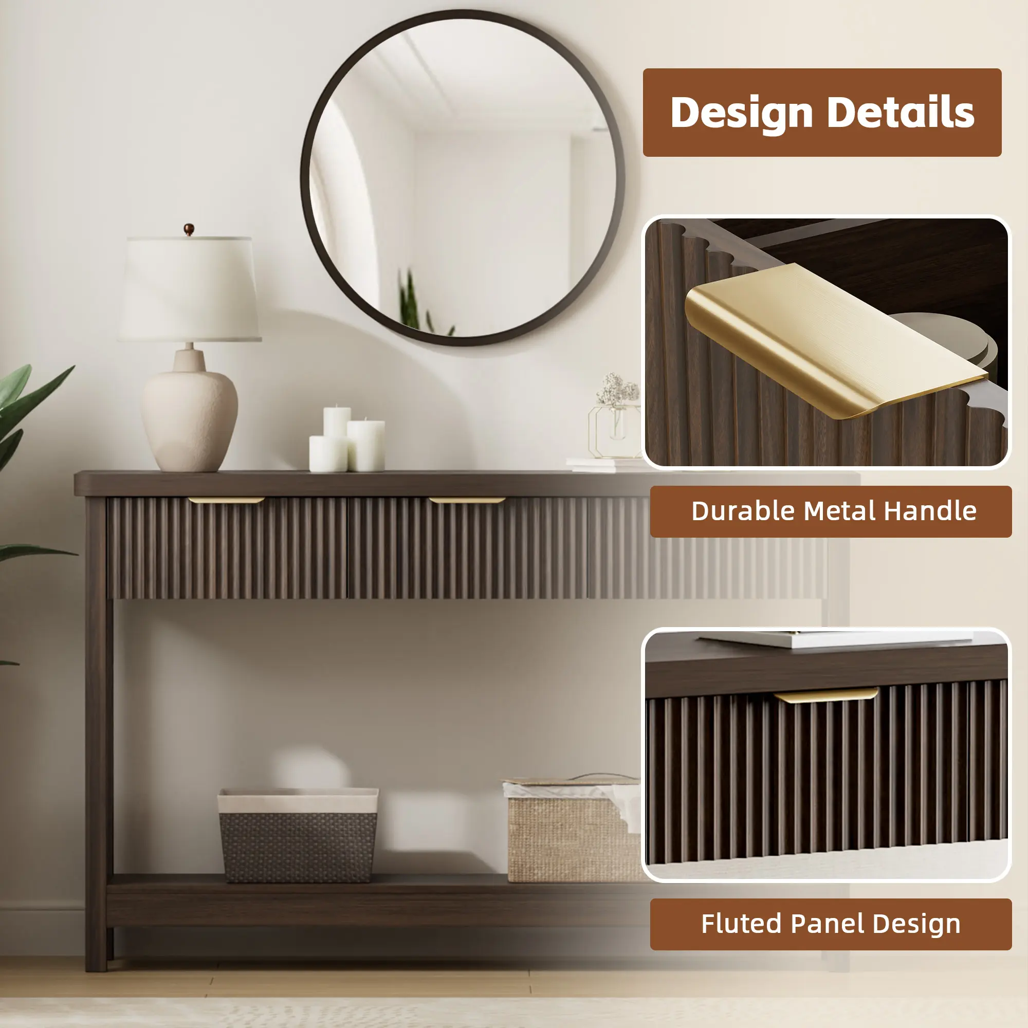 The modern fluted design with sleek metal handles blends effortlessly with farmhouse, rustic, or transitional interiors — ideal for entryways, hallways, or behind the sofa.