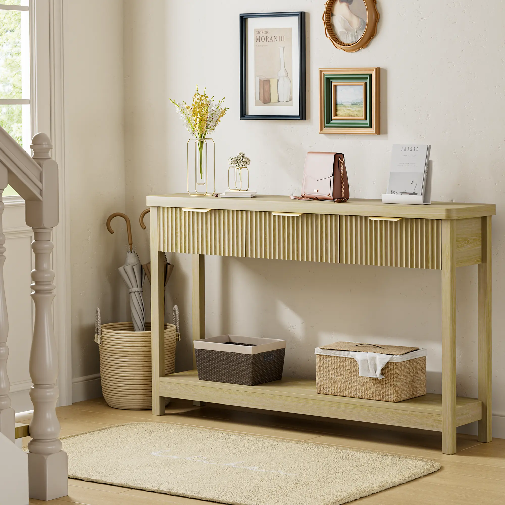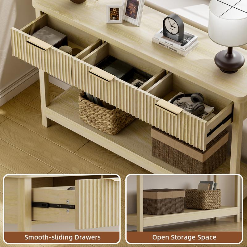 Featuring 3 smooth-glide drawers and an open lower shelf, this entryway table keeps keys, mail, gloves, and small essentials neatly hidden, while the open shelf is perfect for baskets, books, or décor you want within reach.