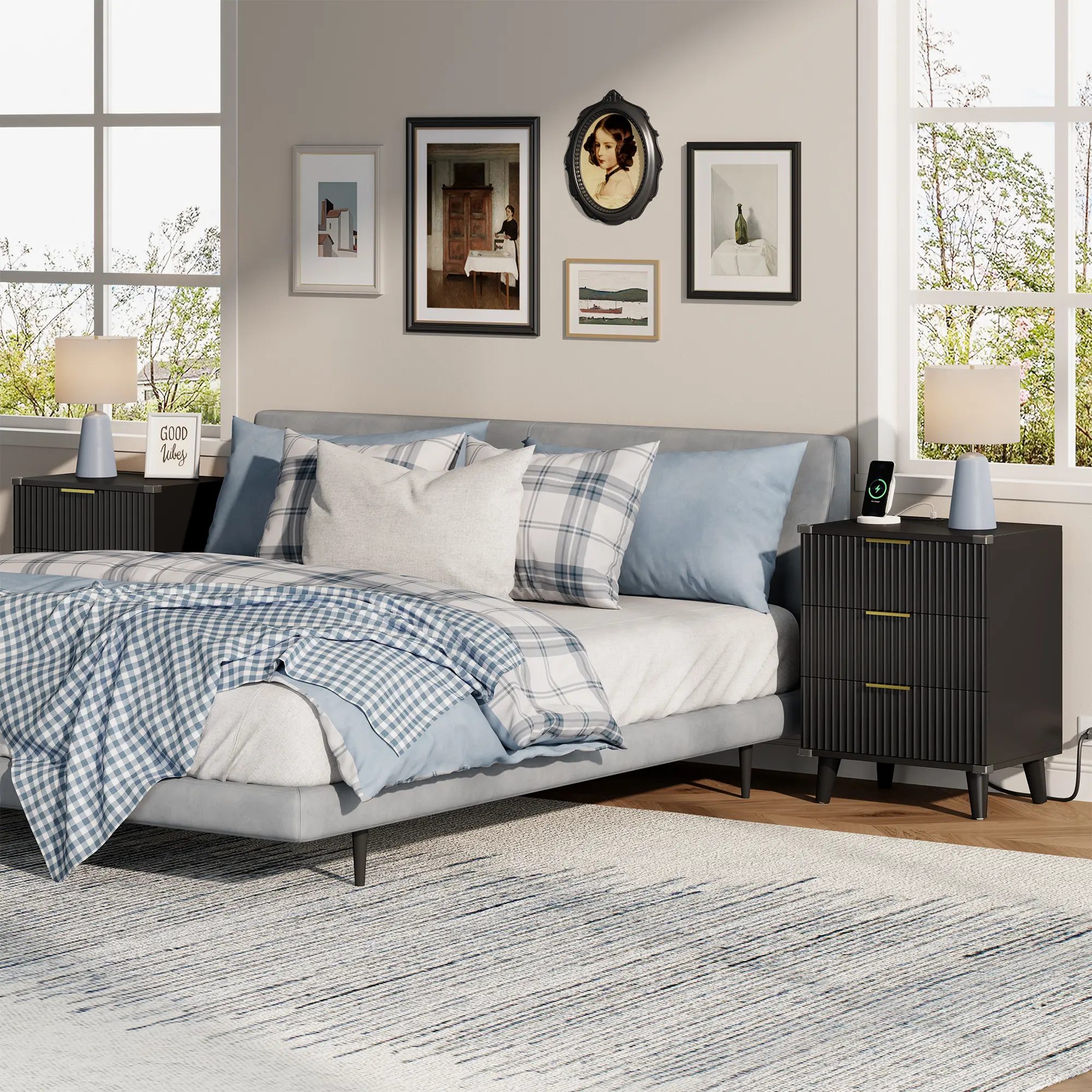 Each nightstand features 3 deep drawers, offering plenty of space for books, glasses, chargers, and daily essentials. The wide tabletop doubles as a stylish display for lamps, clocks, plants, or photos.