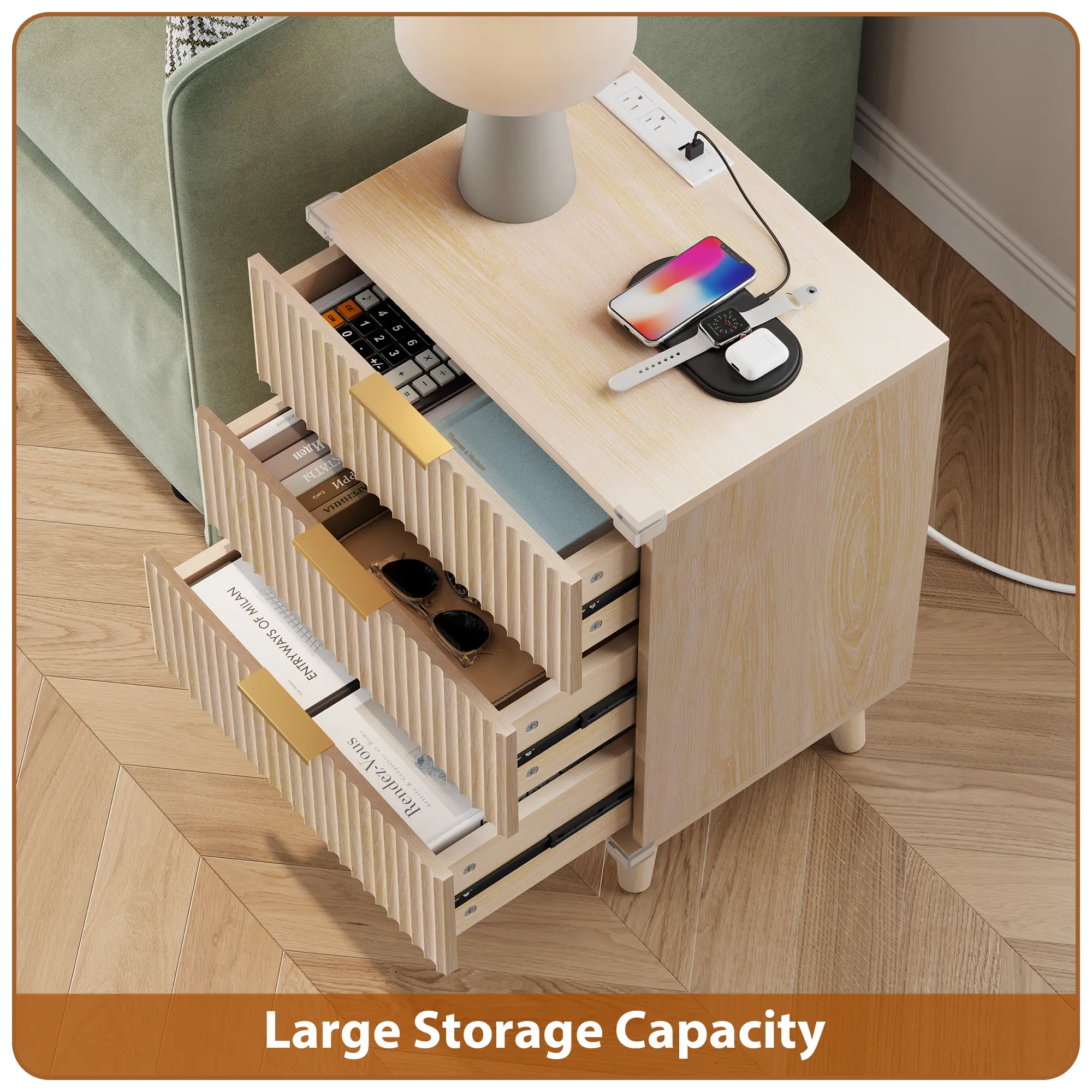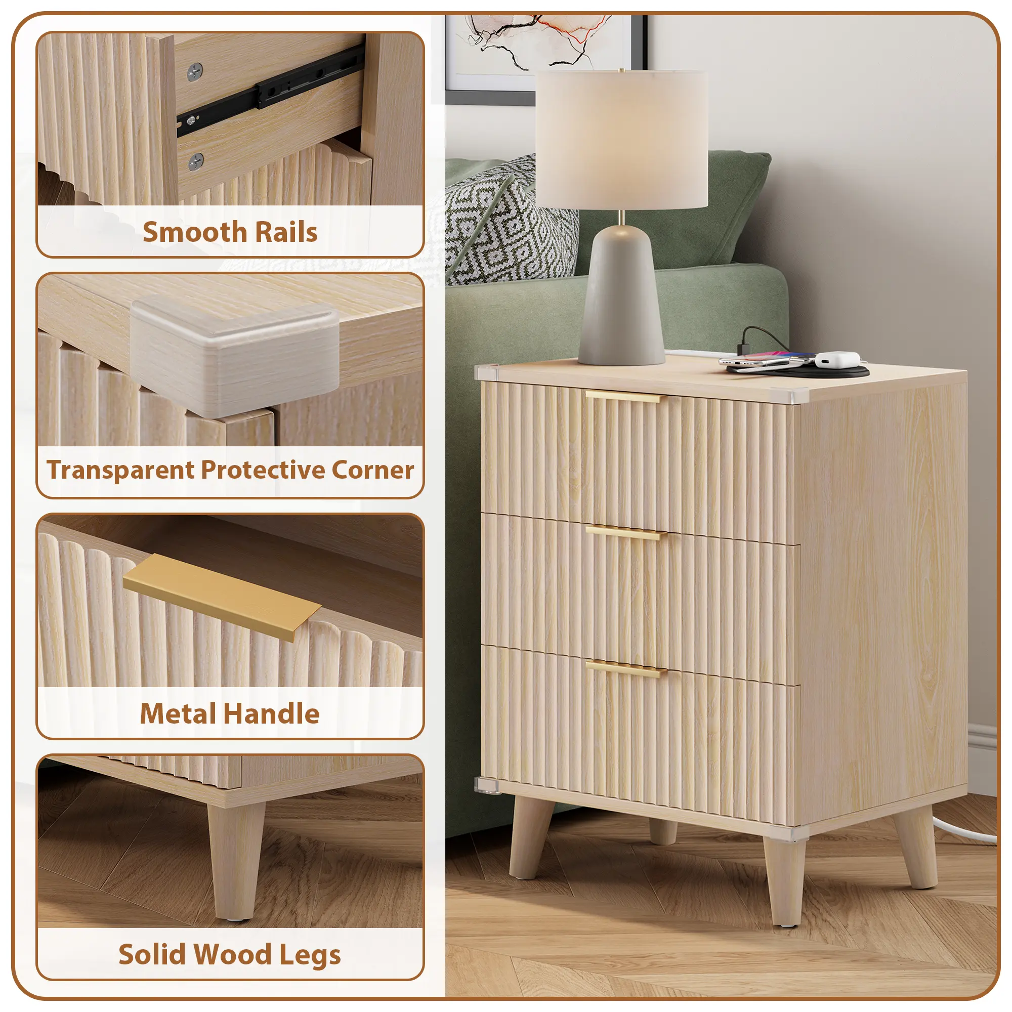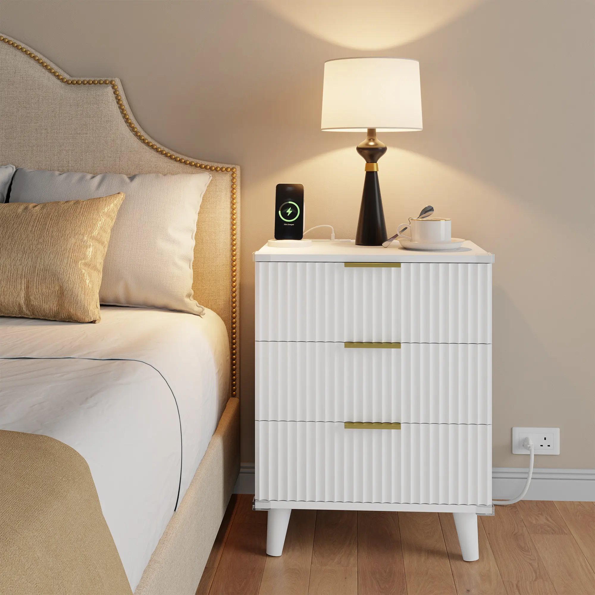This fluted nightstand set of 2 combines modern boho style, built-in charging, and practical storage, creating a calm, organized bedside you’ll enjoy every day.