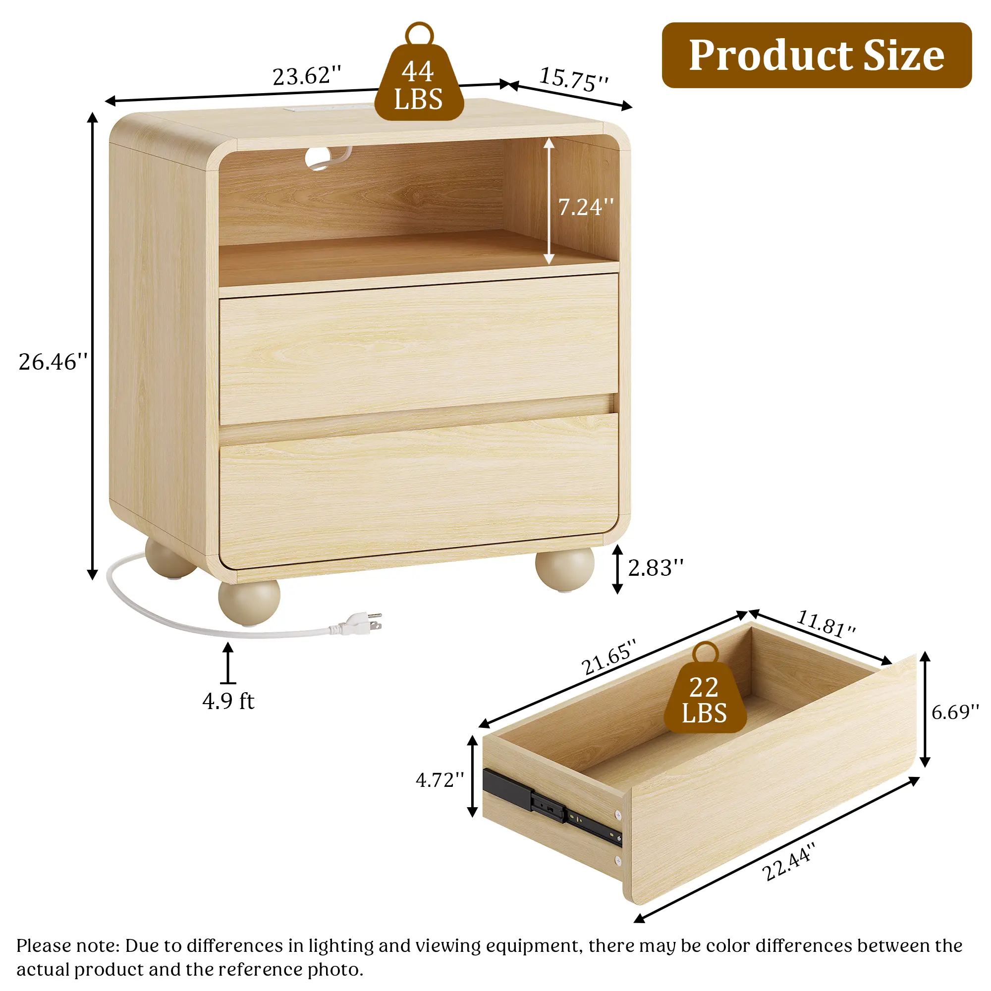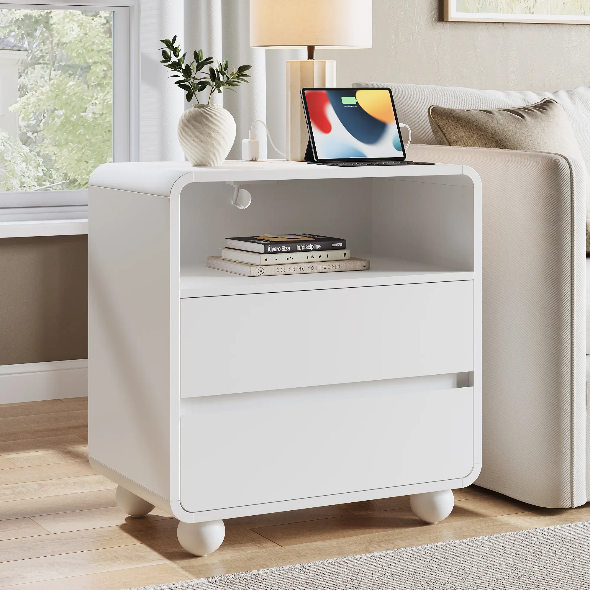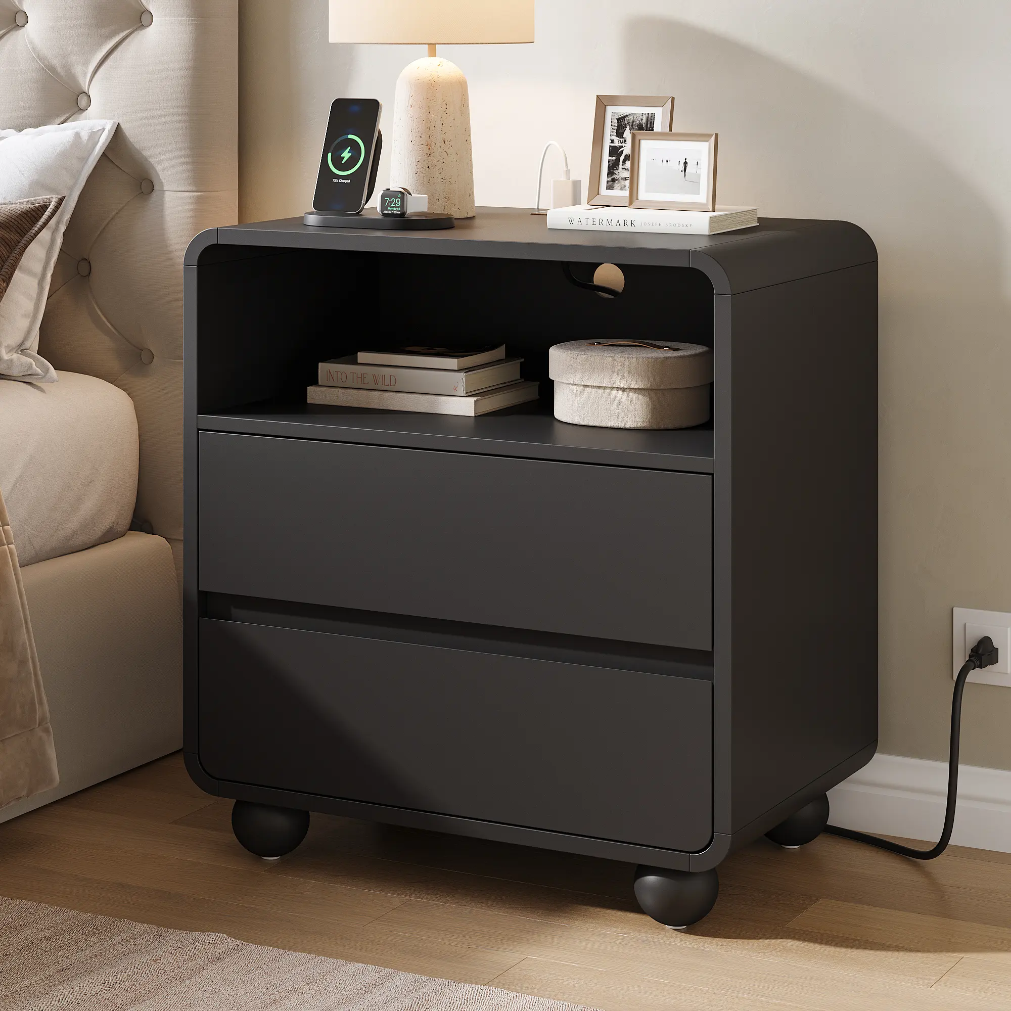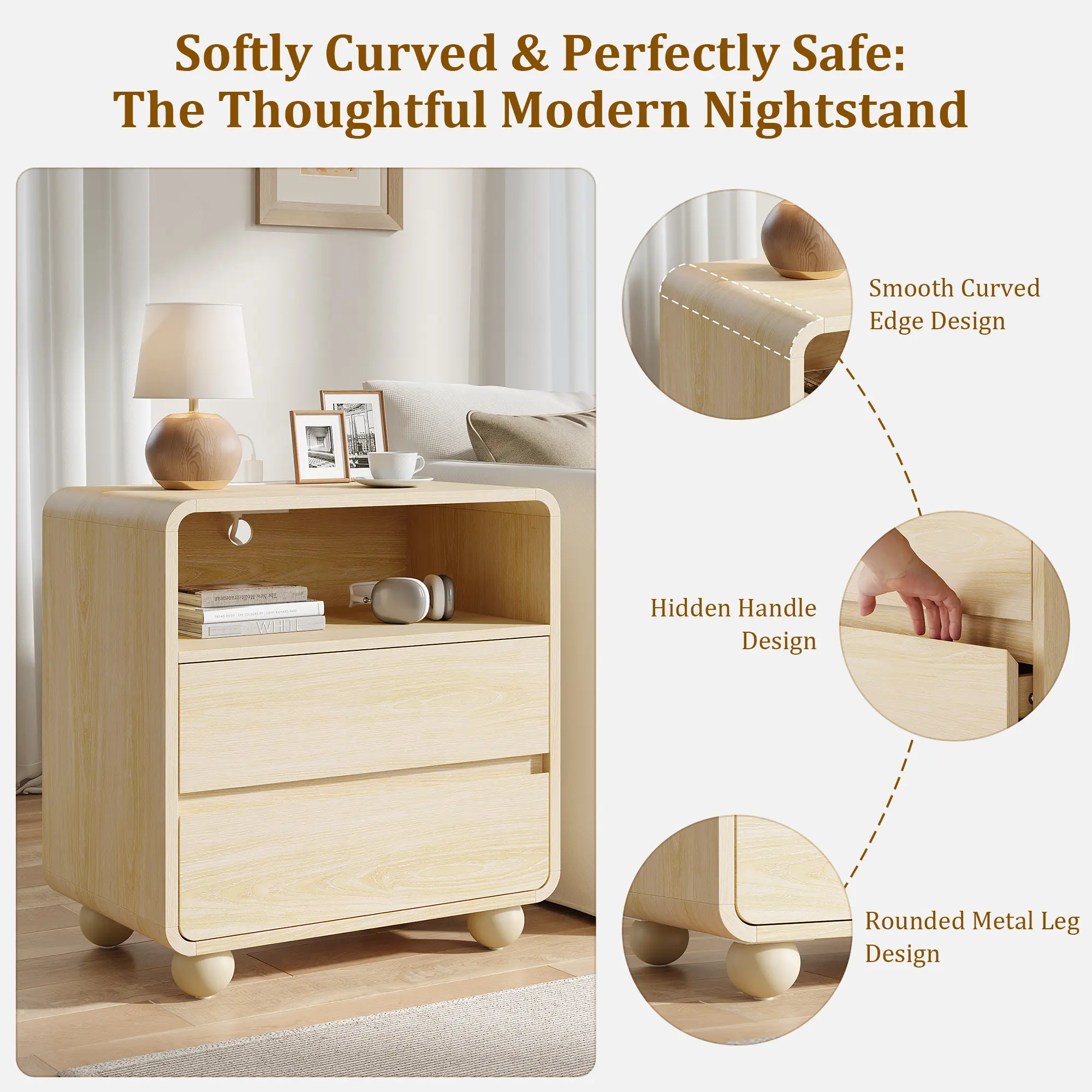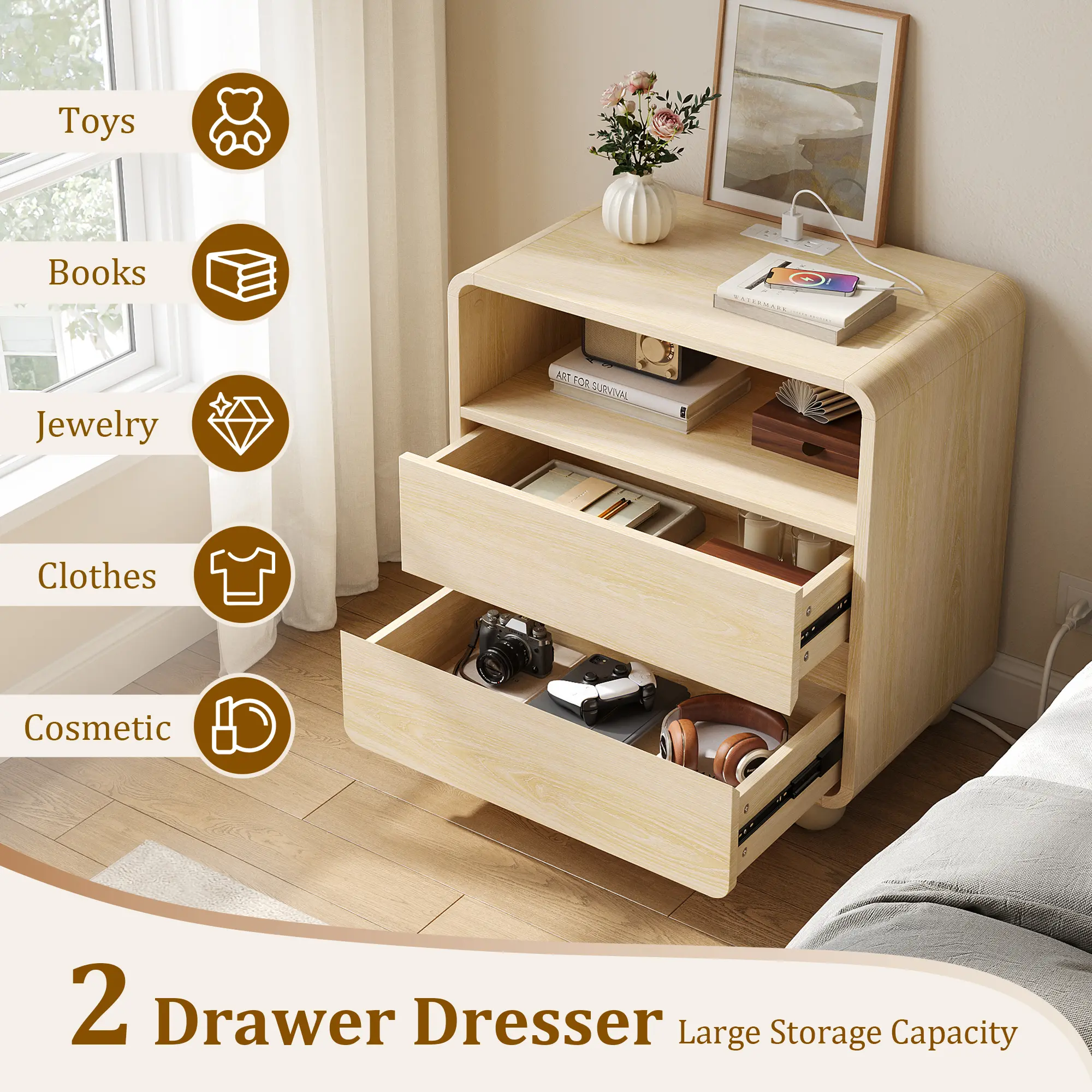 ✨ This bedside table features a smooth, curved design for safety and modern appeal. Its natural texture blends seamlessly into any decor, making it a perfect choice for bedroom use. It complements a dresser and nightstand set.
