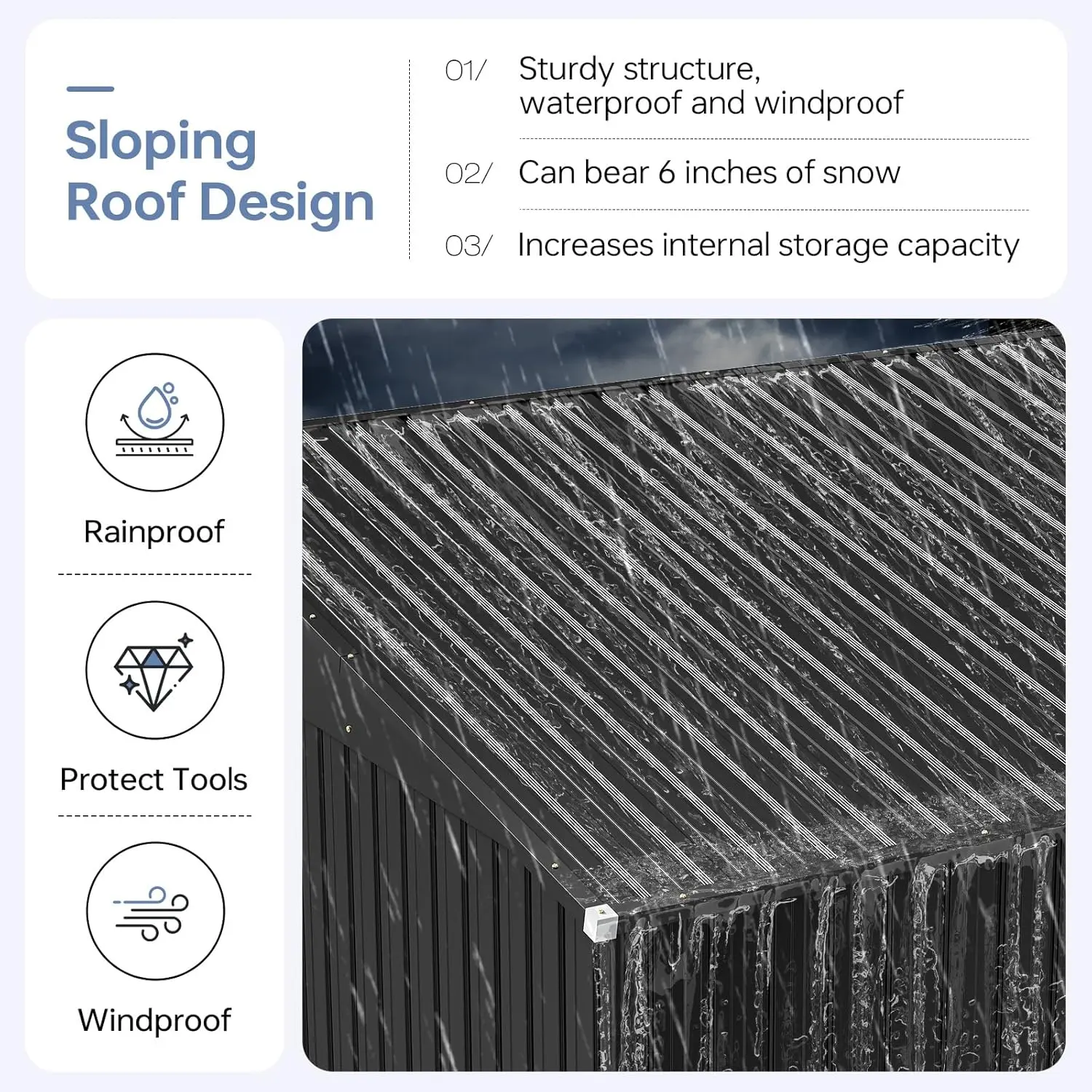 ·Sloped Roof: Practical, water-shedding design prevents pooling and leaks, maximizing interior height.