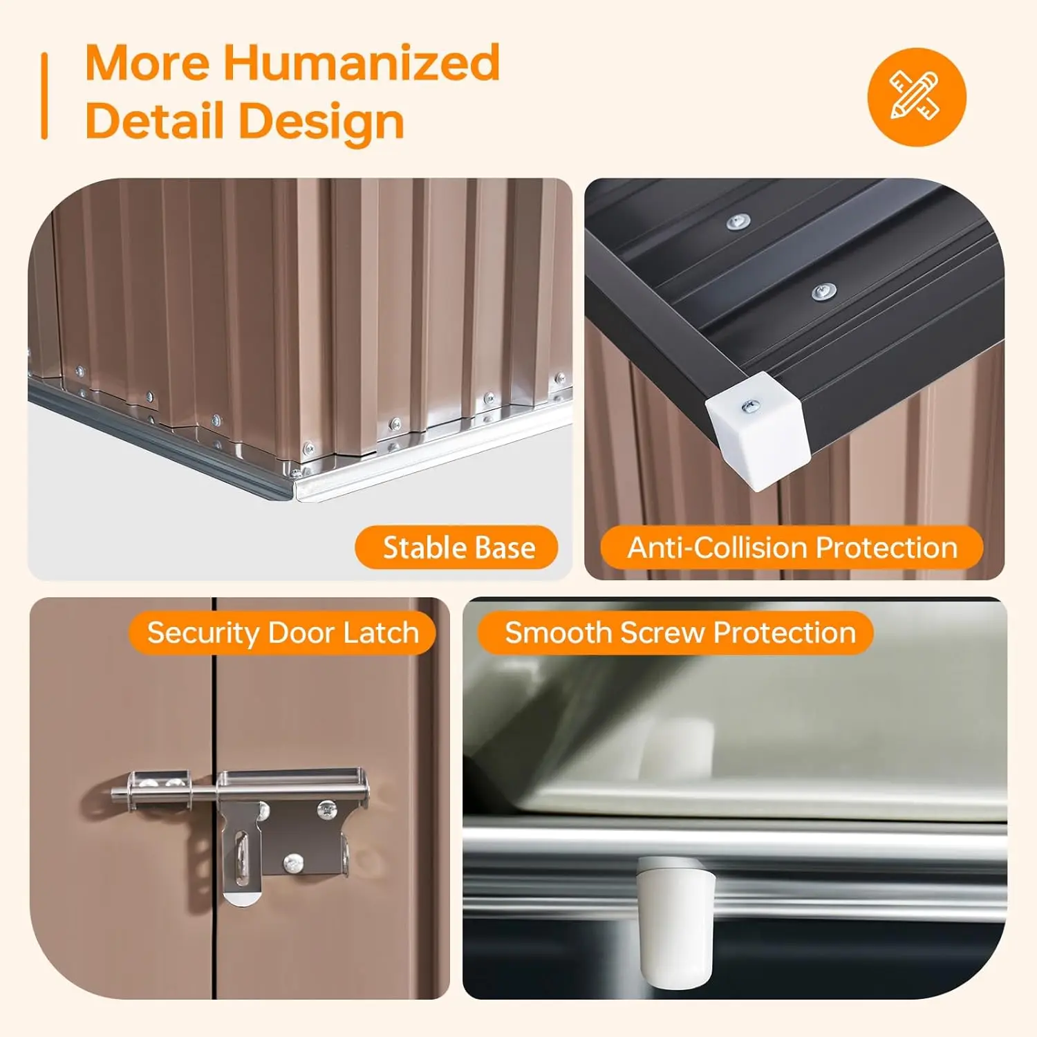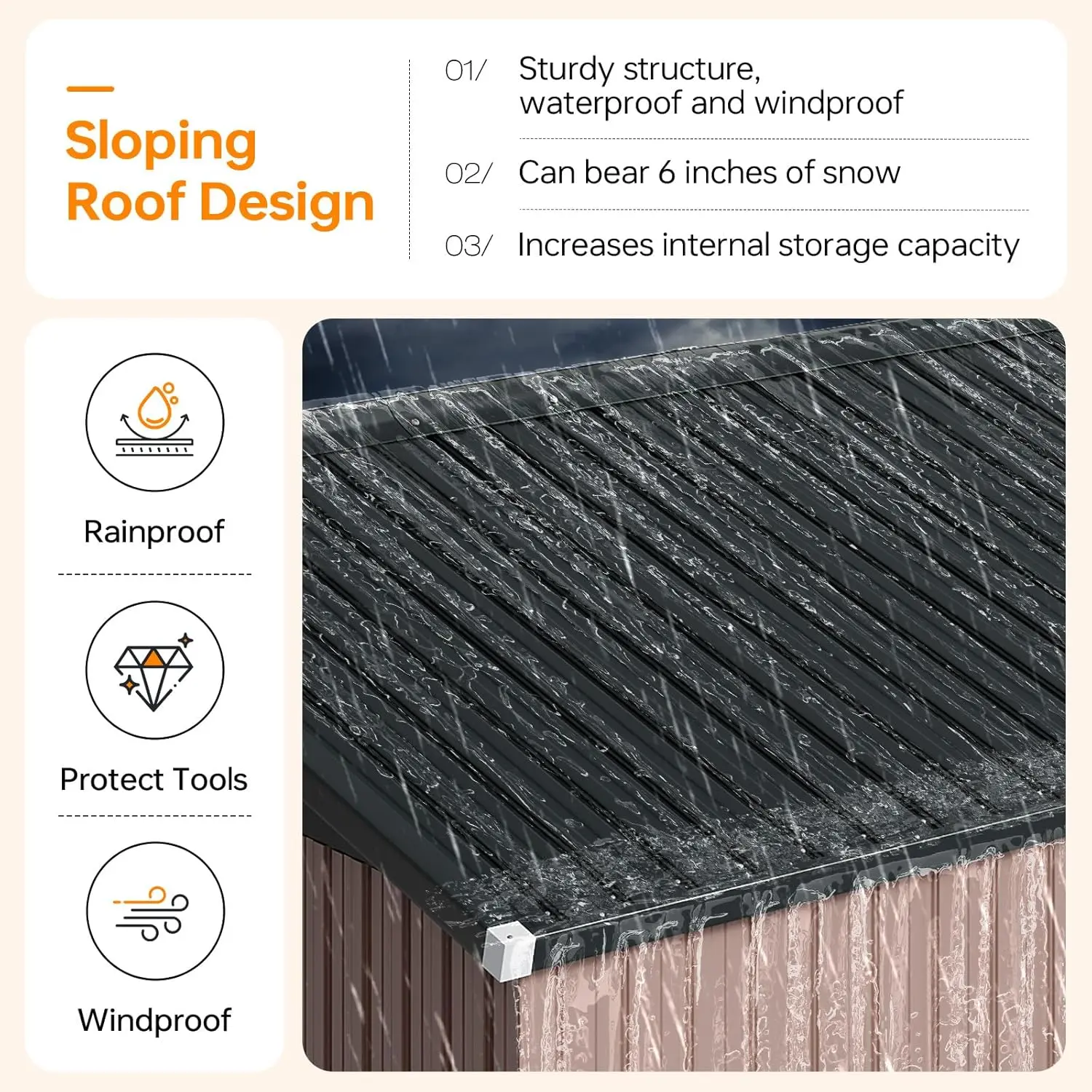 Designed to brave the elements, this shed features a sloped roof that promotes quick water runoff, preventing pooling and rust. The galvanized steel construction offers advanced corrosion resistance and UV protection, keeping your belongings safe from rain, snow, and harsh sunlight. Your tools stay dry, mold-free, and protected in every season.