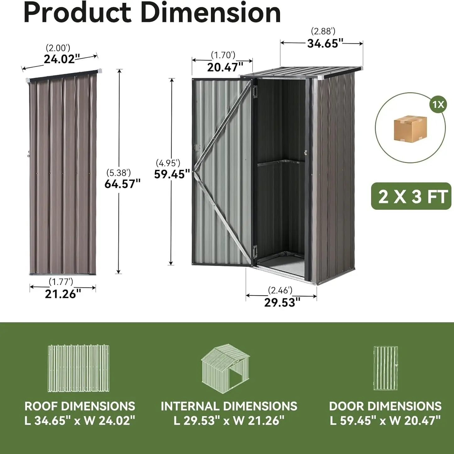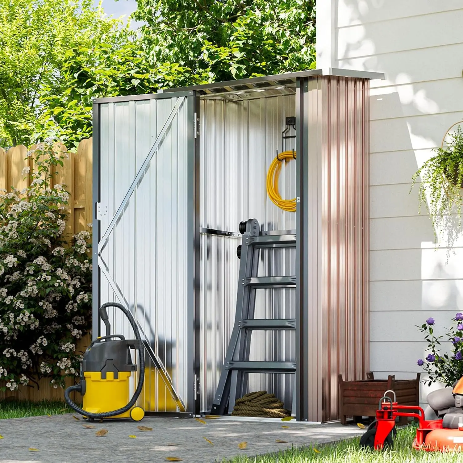 Despite its compact 5.3 x 3 FT footprint, this storage shed offers generous interior space (63" L x 37.6" W x 67" H) to accommodate all your outdoor essentials. Store everything from snow blowers and lawn mowers to bicycles, patio chairs, and kids' toys. The vertical design also allows you to add hanging racks for organizing shovels, umbrellas, ladders, and more—maximizing every inch of storage.