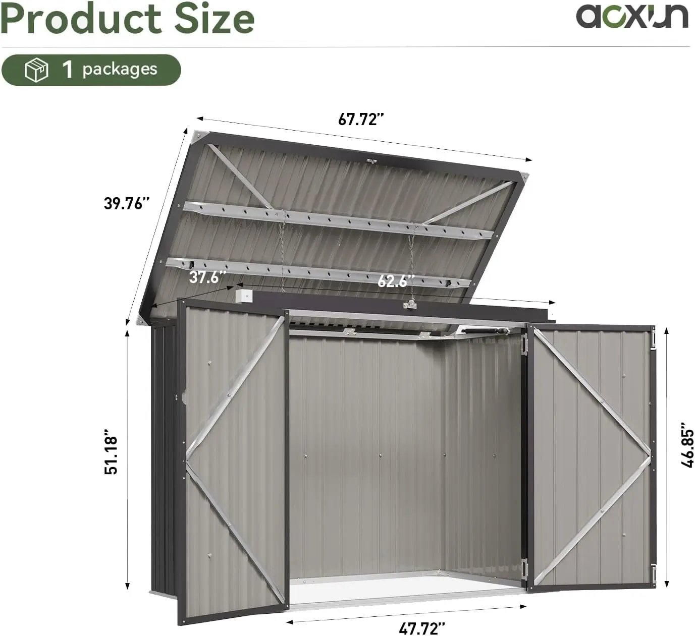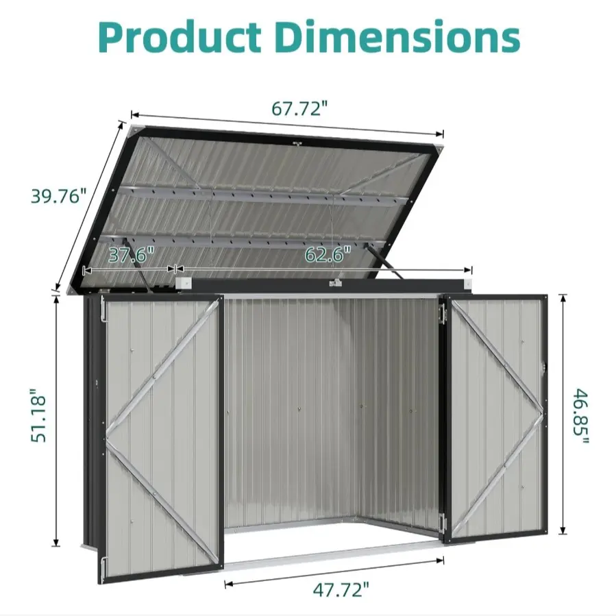 ·Large volume: The 80 CU.FT outdoor storage shed, measuring 59.8"L x 32.3"W x 47.2"H, offers ample space to accommodate the garbage bin and eliminates concerns regarding insufficient internal storage capacity. Additionally, it serves as a convenient solution for organizing and maintaining outdoor supplies such as shovels, lawn mowers, ladders, bikes, and tents