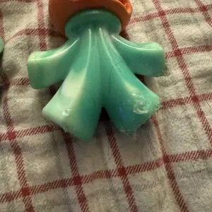 TOO DANGEROUS the green is hard hard plastic the orange end hard plastic… my dog loves it…im tossing