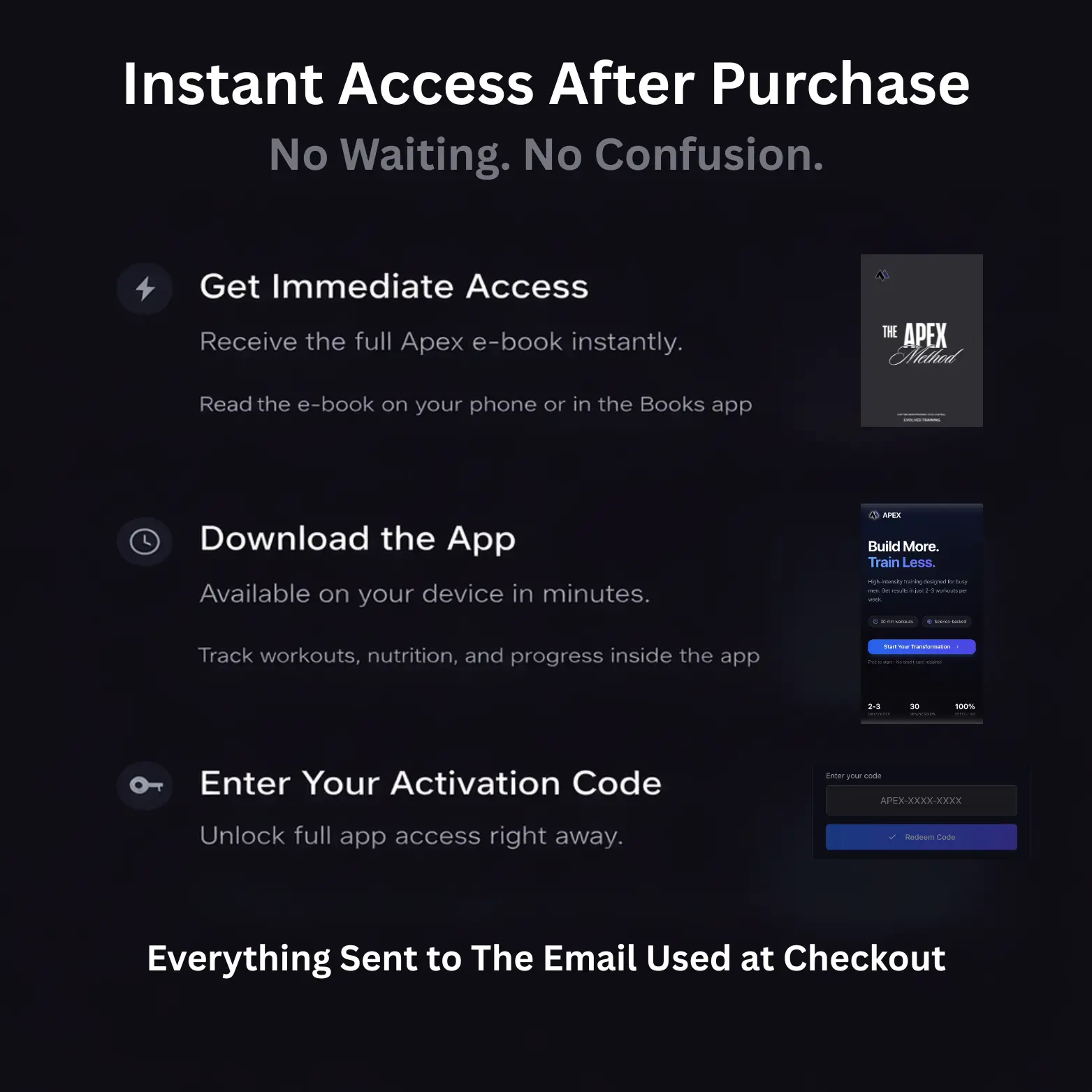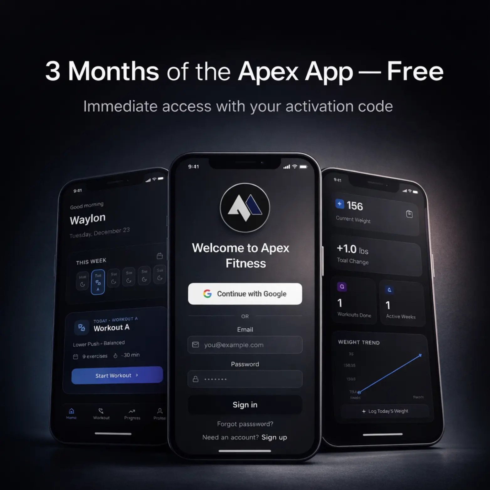 Most programs push more workouts, more sets, and more confusion. Apex does the opposite. You train fewer days per week, push each set with intent, and allow your body to recover and grow.