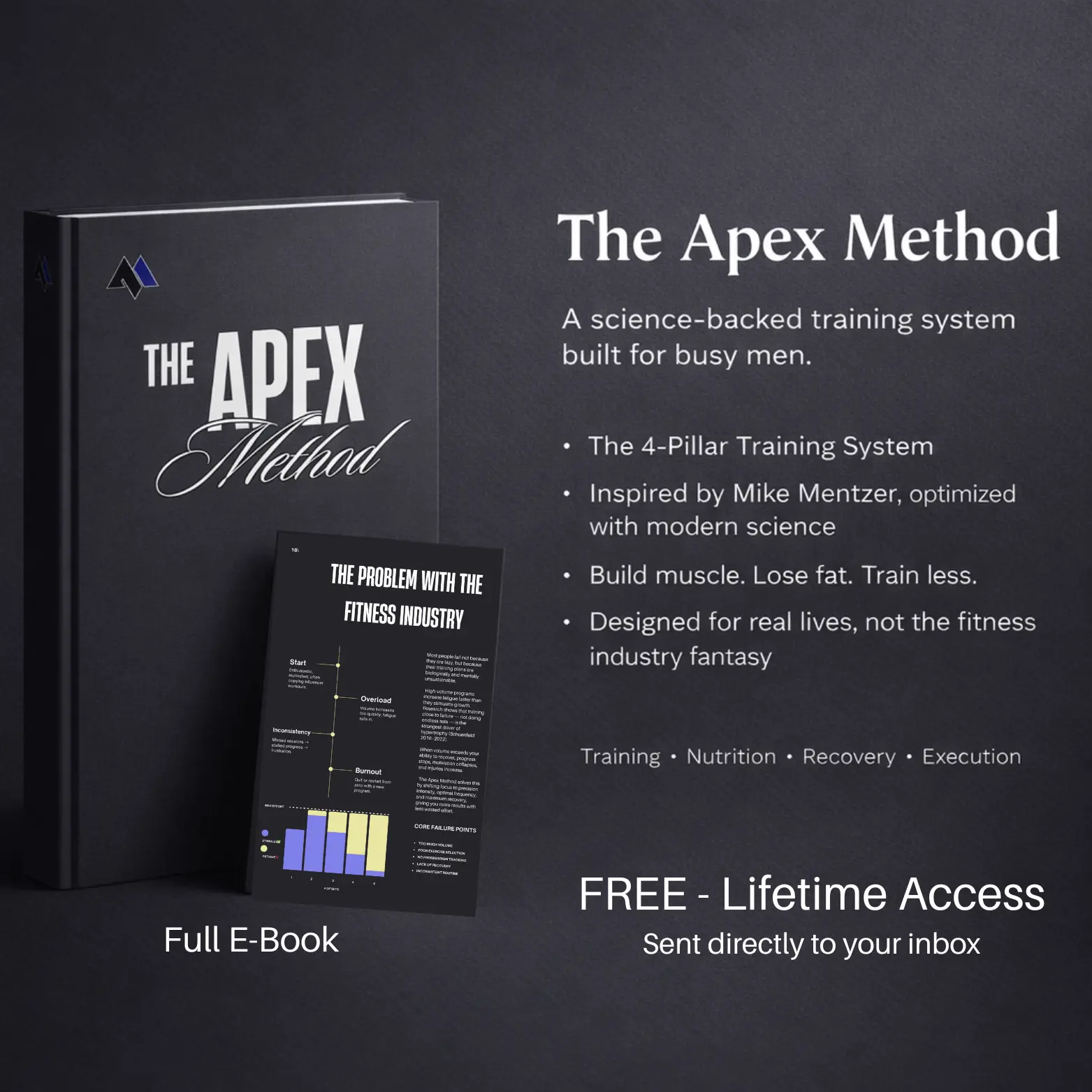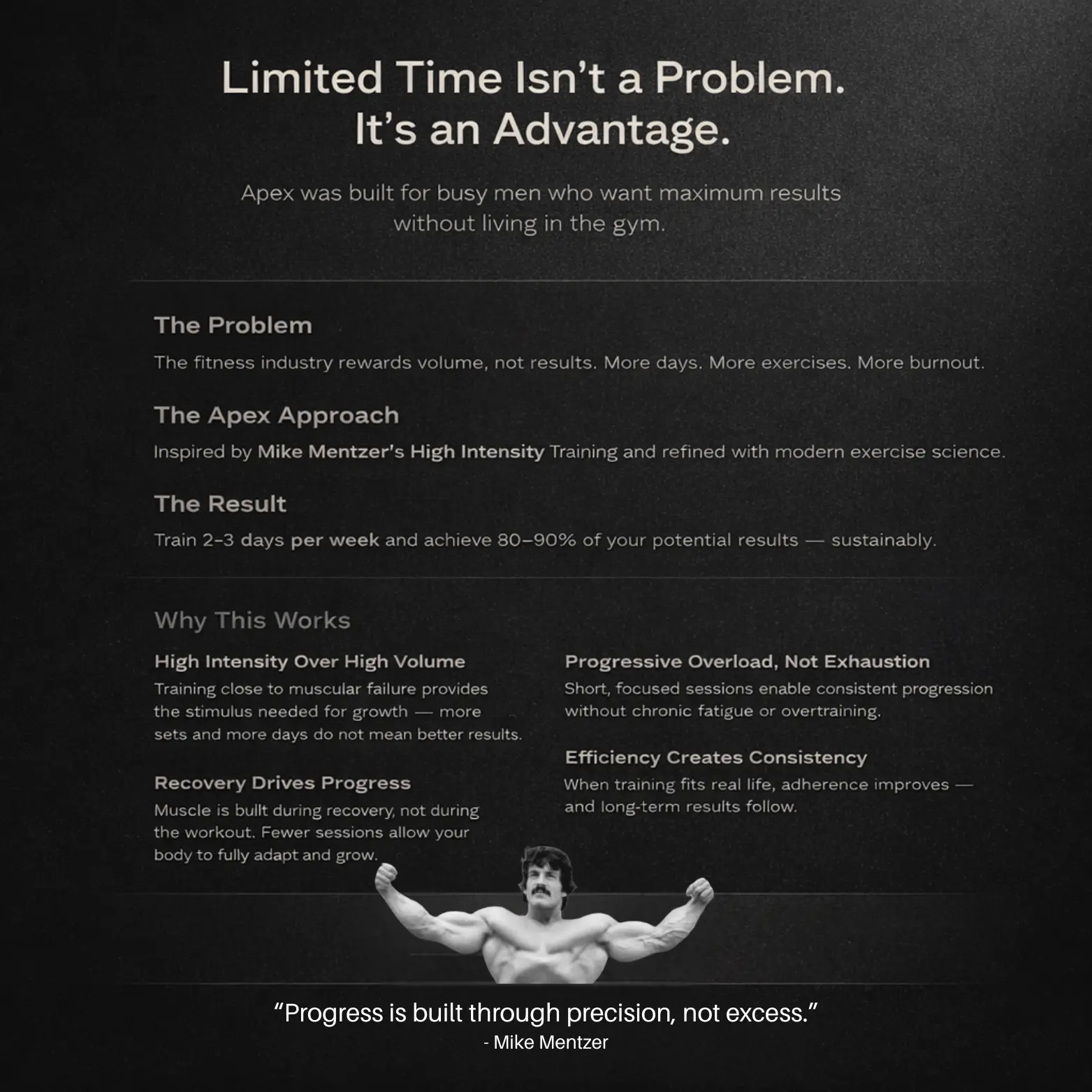 The Apex Training Bundle is a high-intensity strength system designed for busy men who want maximum results with minimal volume. Inspired by Mike Mentzer’s high-intensity philosophy and refined with modern training science, Apex focuses on training harder, recovering longer, and progressing consistently.