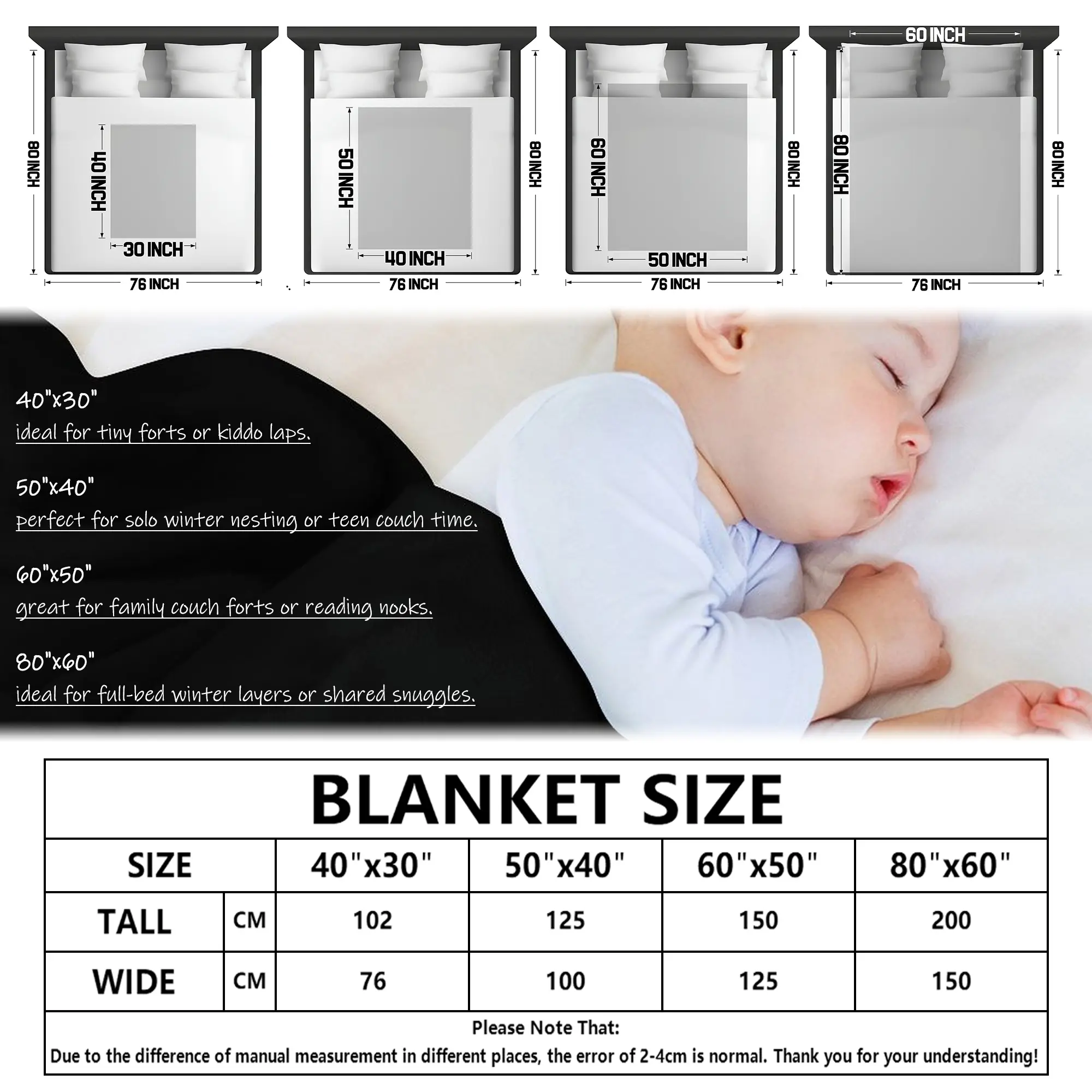 80"x60" (200x150cm). Perfect for women & men. In summer, it is an ideal air condition quilt to provide you with warmth without making you feel too heavy and uncomfortable. In winter, it is an ideal thermal flannel bedding throws to provide you with continuous warmth and better sleep quality.