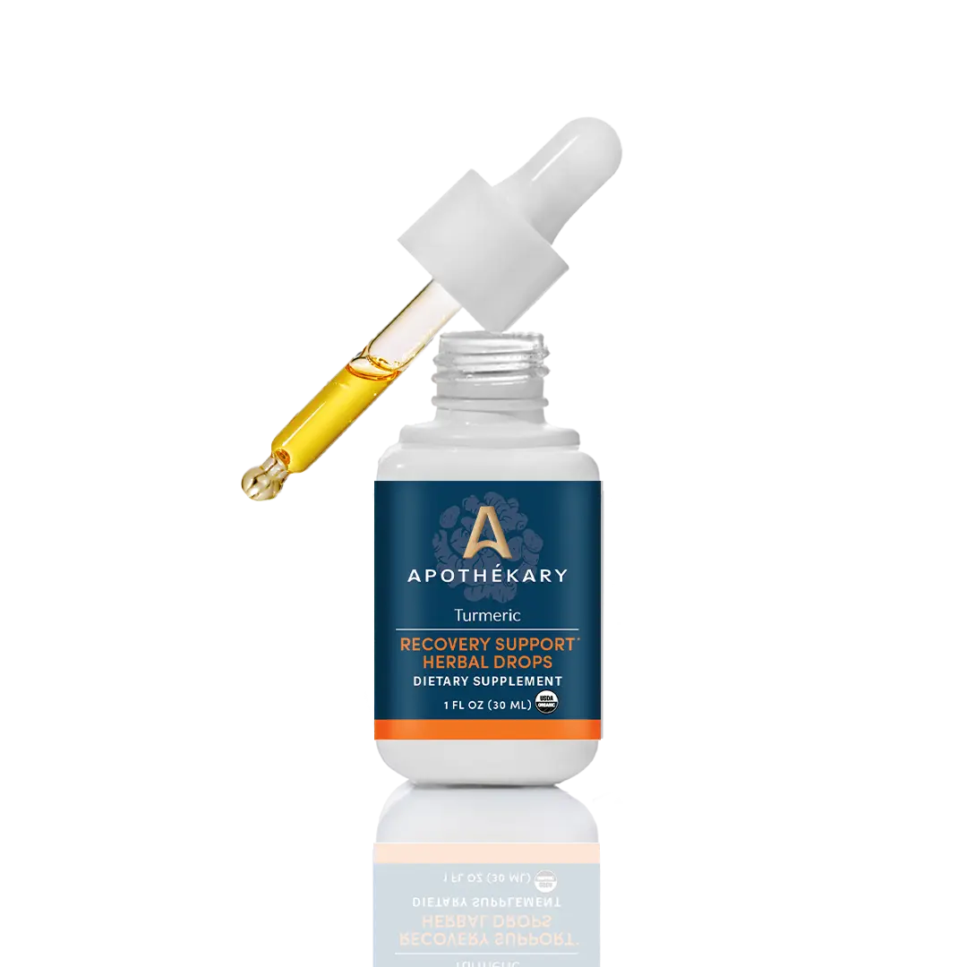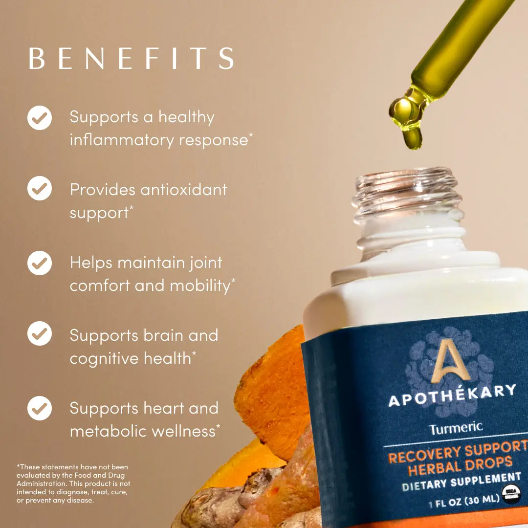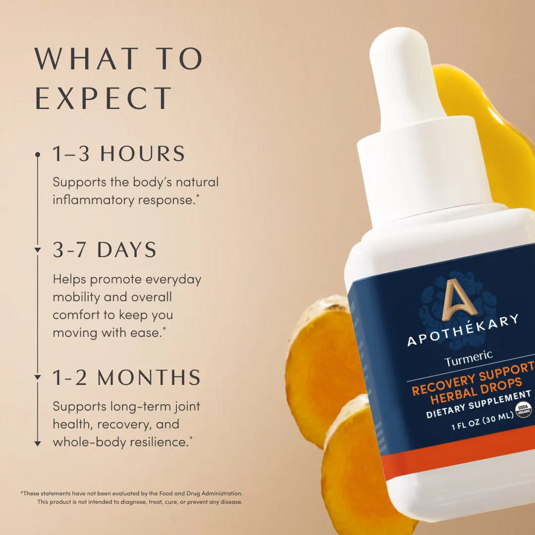 Apothékary Turmeric Recovery Support Herbal Drops - Whole-Plant Extract for Joint Comfort & Inflammation - Antioxidant Rich, Alcohol-Free, Clinically-Tested, Certified Gluten-Free, Vegan & Cruelty-Free, Third Party Tested, Plant-Based, Made in the USA