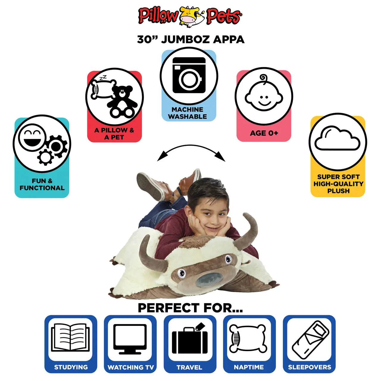Simply sweet, fluffy and fabulously soft, this HUGE Pillow Pet is perfect for playtime, anthe best cuddle buddy at bedtime. Surprise your little one with a Jumbo Appa Pillow Pet that they will love endlessly as a child, snuggle with as a teen, and end up taking to college. Pillow Pets bring joy, security, comfort and smiles to all ages. Super soft, parent approved, fun and functional, high quality plush designs that last through childhood and beyond.