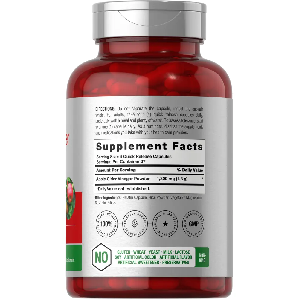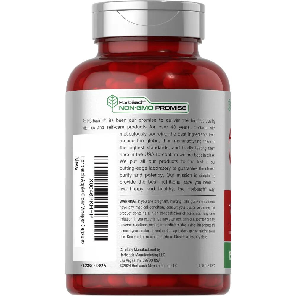 Get premium support with Horbaach Apple Cider Vinegar. This highly innovative formula features 1,800 mg of Apple Cider Vinegar per serving in quick release capsules. It's gluten-free and non-GMO, with no artificial sweetener or preservatives, making it a high-quality formula for a balanced routine.