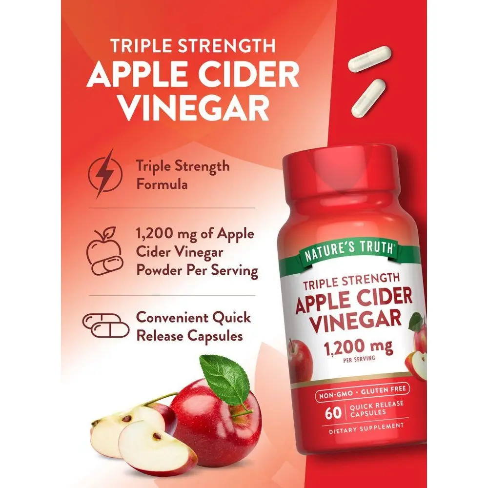Each daily serving of these quick release capsules delivers 1,200 mg of Apple Cider Vinegar powder. These easy-to-take capsules have no harsh vinegar aftertaste and provide triple strength support with traditional goodness from apple cider vinegar.
