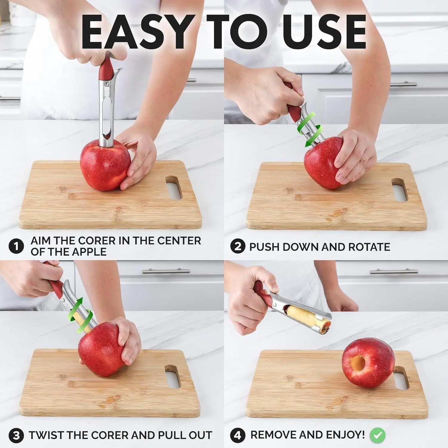 ·Very Easy to Clean: Unlike other corers, this unique twin-blade cutter features a lever that opens easily for quick rinsing. It’s also dishwasher-safe for a thorough clean.
