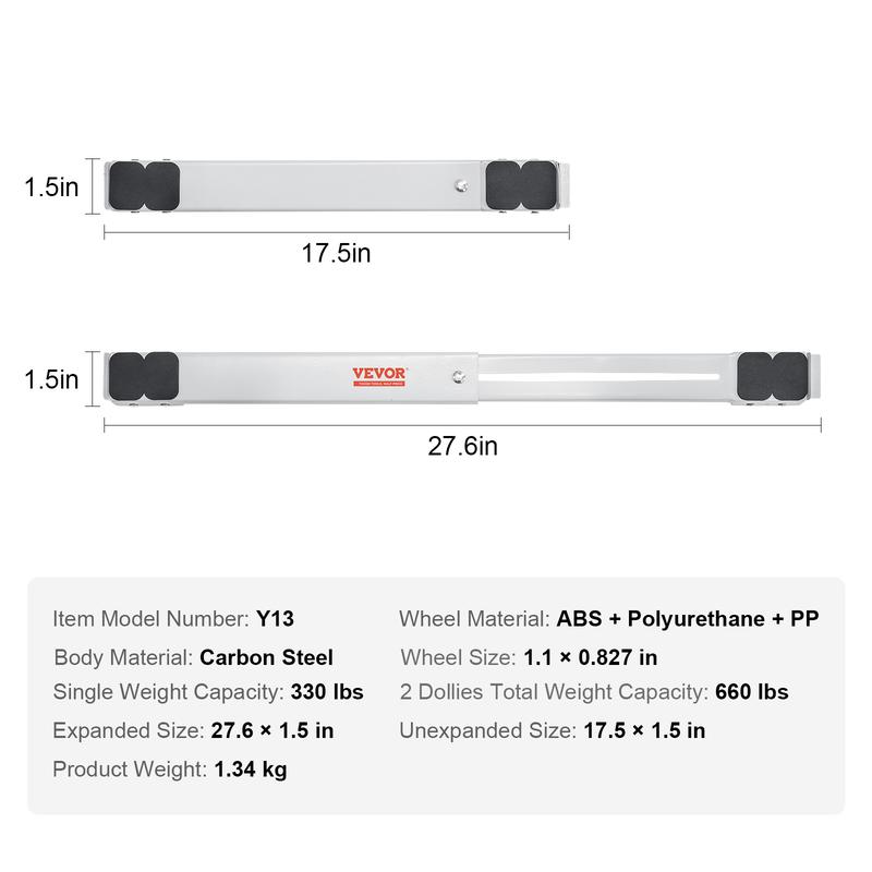 • Adjustable Furniture Dolly: With our appliance roller's double-row design and simple structure, there's no need for complicated installations. It effortlessly extends from 17.5 inches to 27.6 inches, fitting perfectly under any furniture, from refrigerators and washing machines to dryers and more!