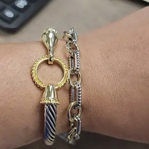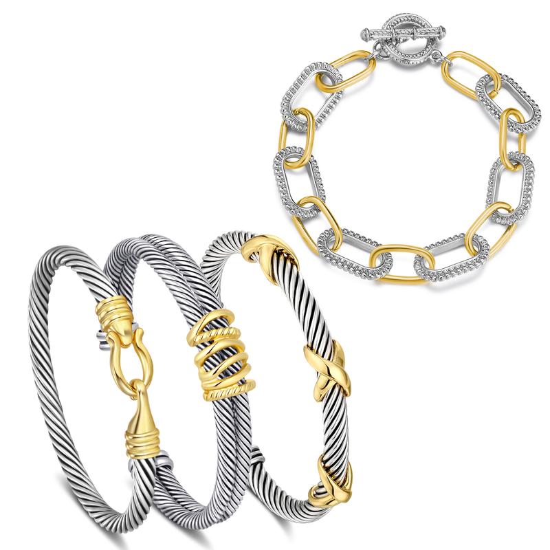 Three-Piece Statement Set: Includes two twisted cable bangles and one chain link bracelet, each with distinct closures and accents for a dynamic stacked look.