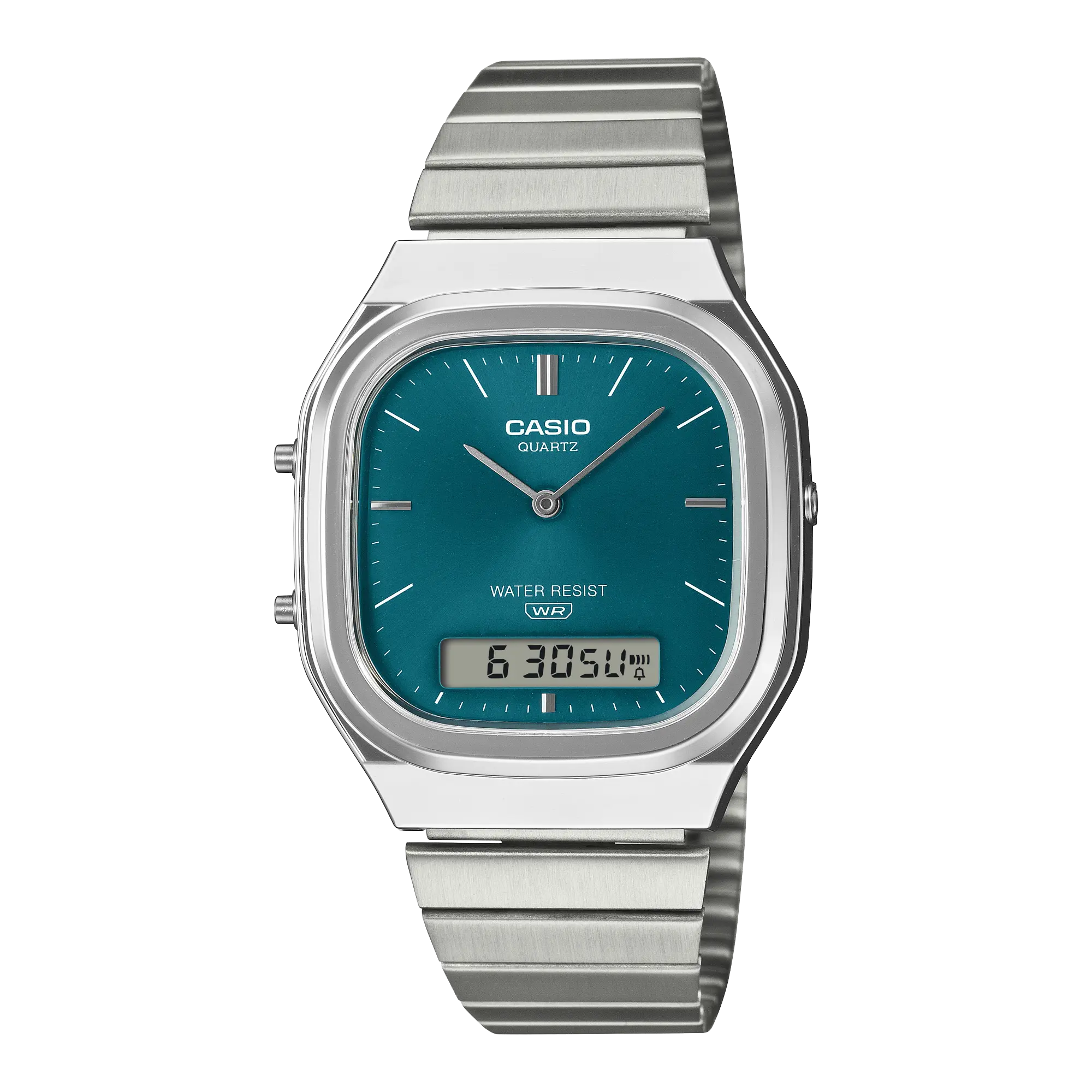 Give your retro style a modern twist, or your contemporary fashion a vintage touch. Either way you go, the refined and flowy AQ-240E strikes the right chord. The analog-digital AQ-240 with dual display goes retro-modern. With a slightly rectangular face offset by a gently rounded case and soft metal curves, this watch exudes sophistication. The sun-ray finish on the dial catches the light with a lustrous glow. Metallic indexes that blend a vintage feel with a modern aesthetic add another eye-catching touch. The digital LCD at the 6 o’clock position offers outstanding readability while maintaining a harmonious overall design, creating a timepiece that’s both functional and beautiful.