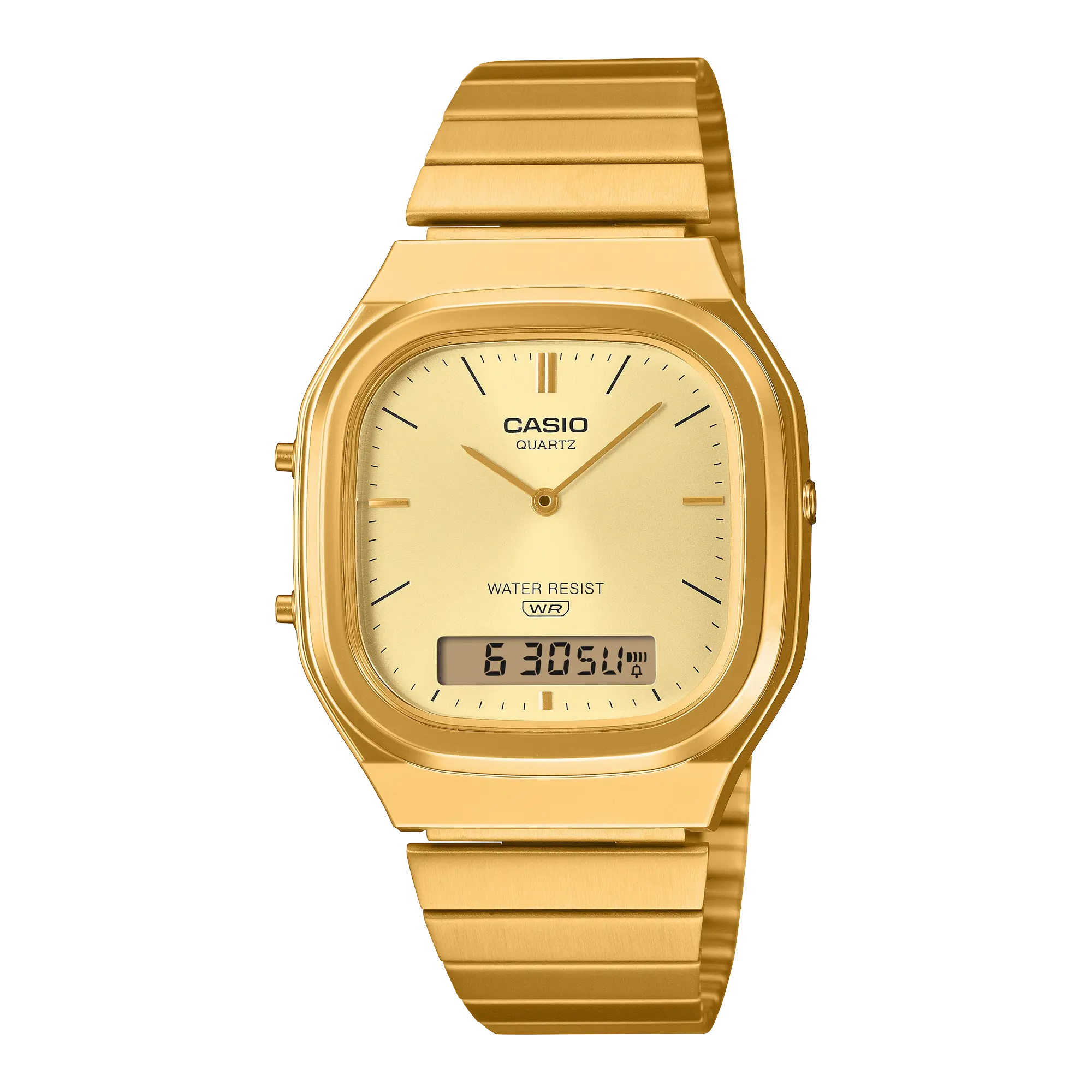 - Iconic Retro Gold Style: Vintage square case with a champagne-gold dial and gold-tone bracelet delivers timeless 80s Casio aesthetic that elevates any outfit. - Analog + Digital Dual Display: Combines classic analog hands with a digital screen so you can track time, date, and functions at a glance. - Dual Time Convenience: Easily keep track of two time zones — perfect for travel, work, or daily multitasking. - Everyday Essential Functions: Features a stopwatch, daily alarm, hourly signal, and automatic calendar for practical daily use. - Slim, Lightweight & Comfortable: Compact profile with an adjustable stainless steel band makes it easy to wear all day with a unisex fit.