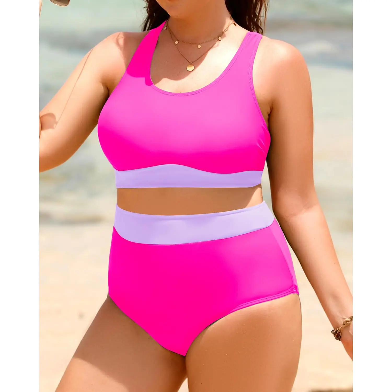 Absolutely love this swimsuit! I love the high waisted bottoms. And the top, holds the girls in place! I’m large Chester and I feel secure with this top!