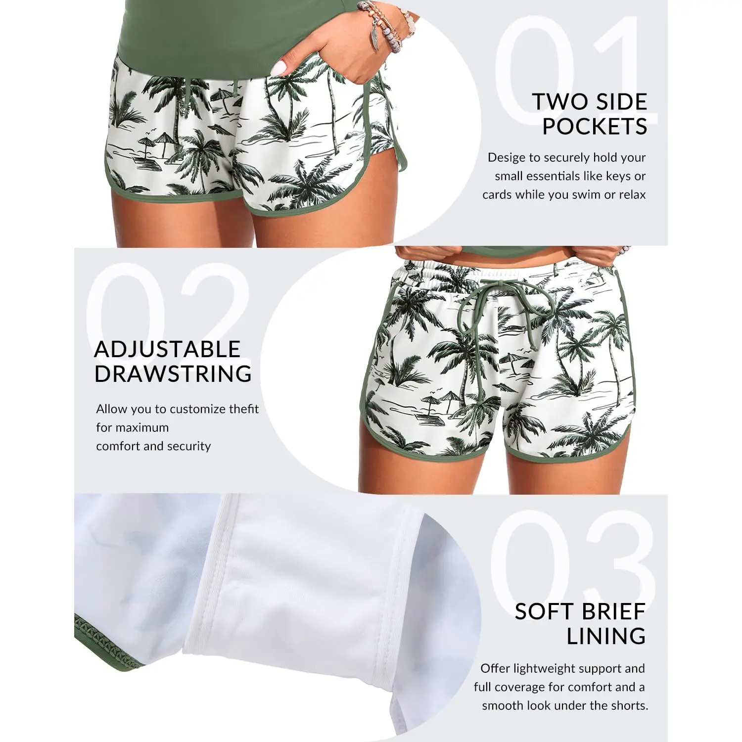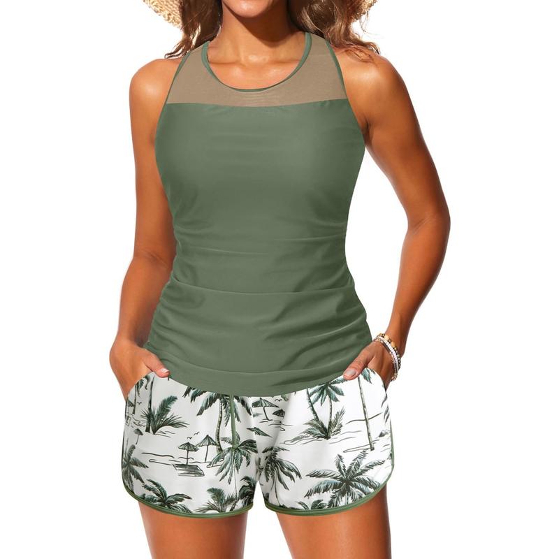 ·Tankini with Shorts: The high waisted shorts feature two convenient side pockets for keys or cards, a built-in brief for comfort, and neatly stitched edges for a smooth and durable finish.