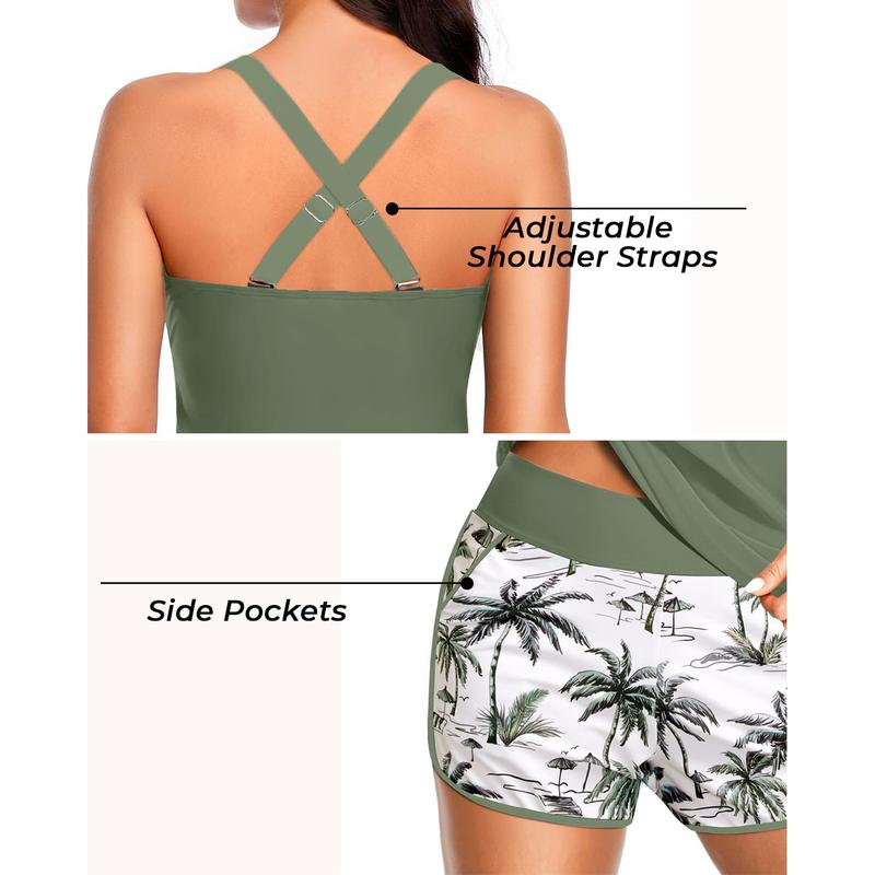 ·Two Piece Tankini: This swimsuit combines a supportive twist front tankini top with removable pads and high waisted board shorts, offering enough coverage.
