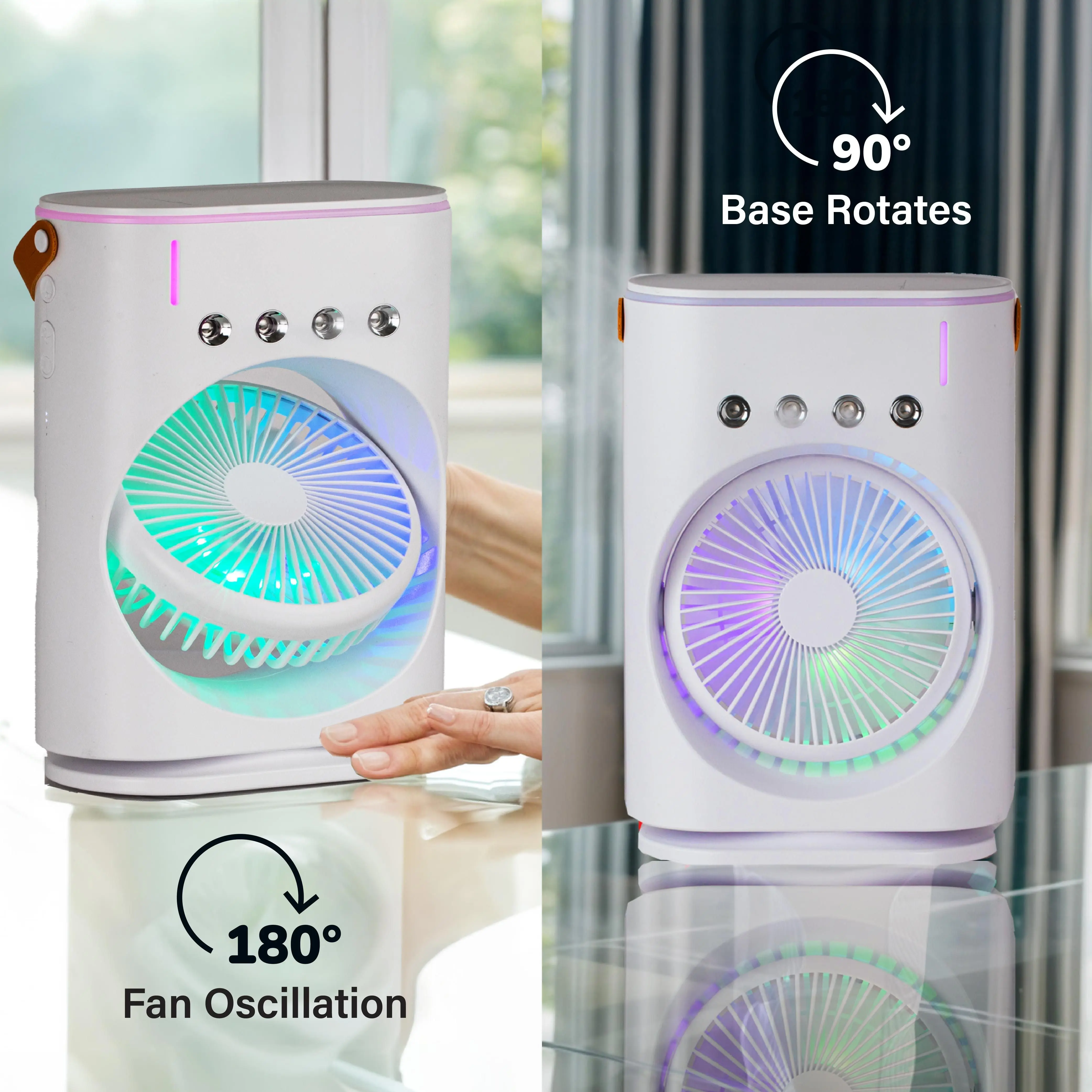 ·DUAL FANS: Two fans mean more cooling power. Each fan is adjustable and rotates up and down, up to 180 degrees, letting you aim the cool airflow right where it’s needed.